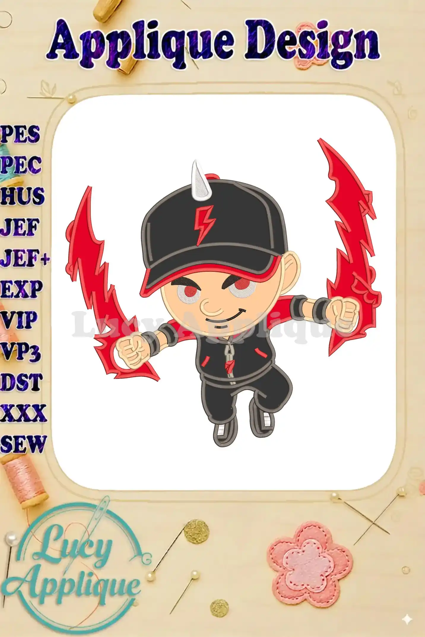 Action BoBoiBoy with red lightning blades applique embroidery designs