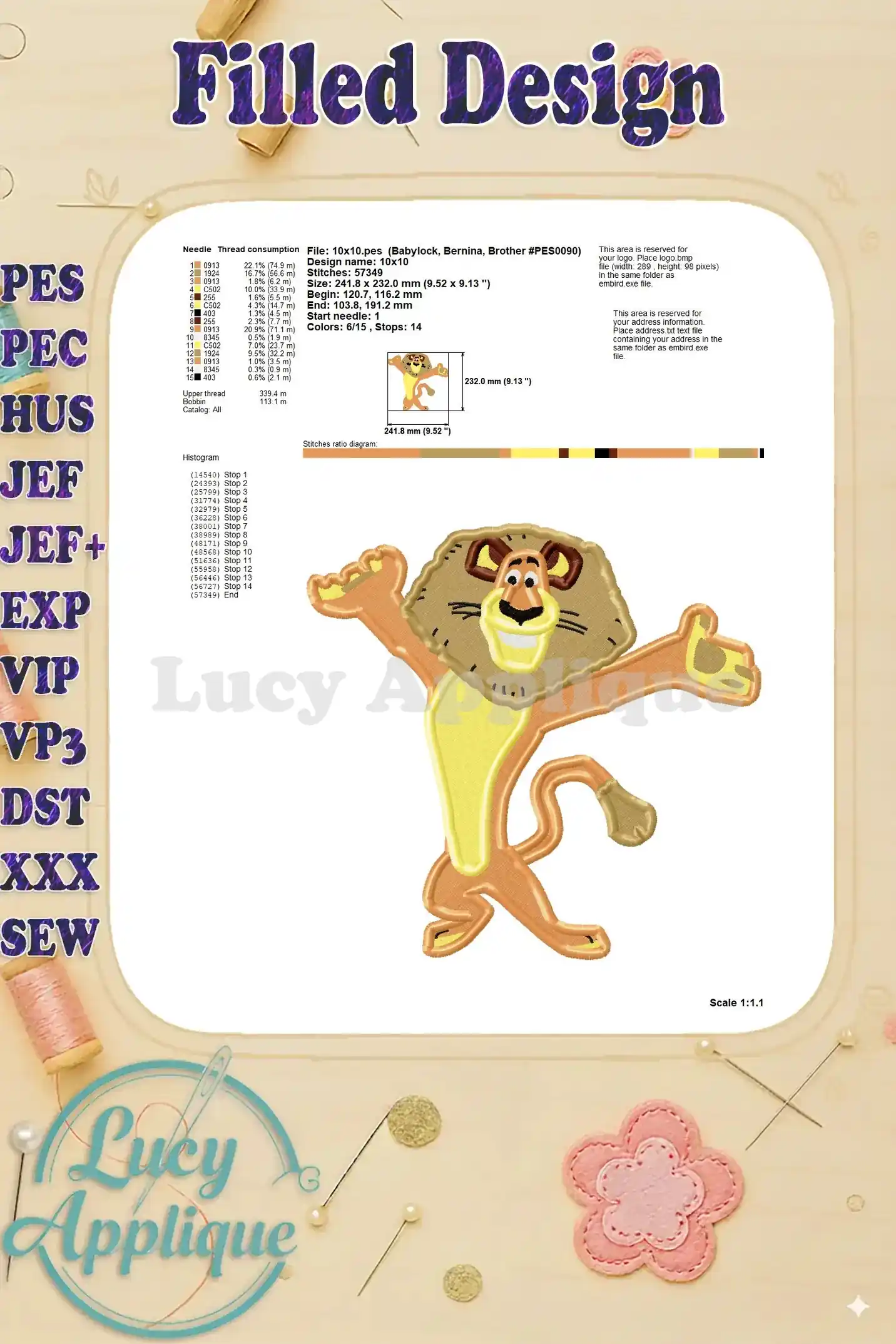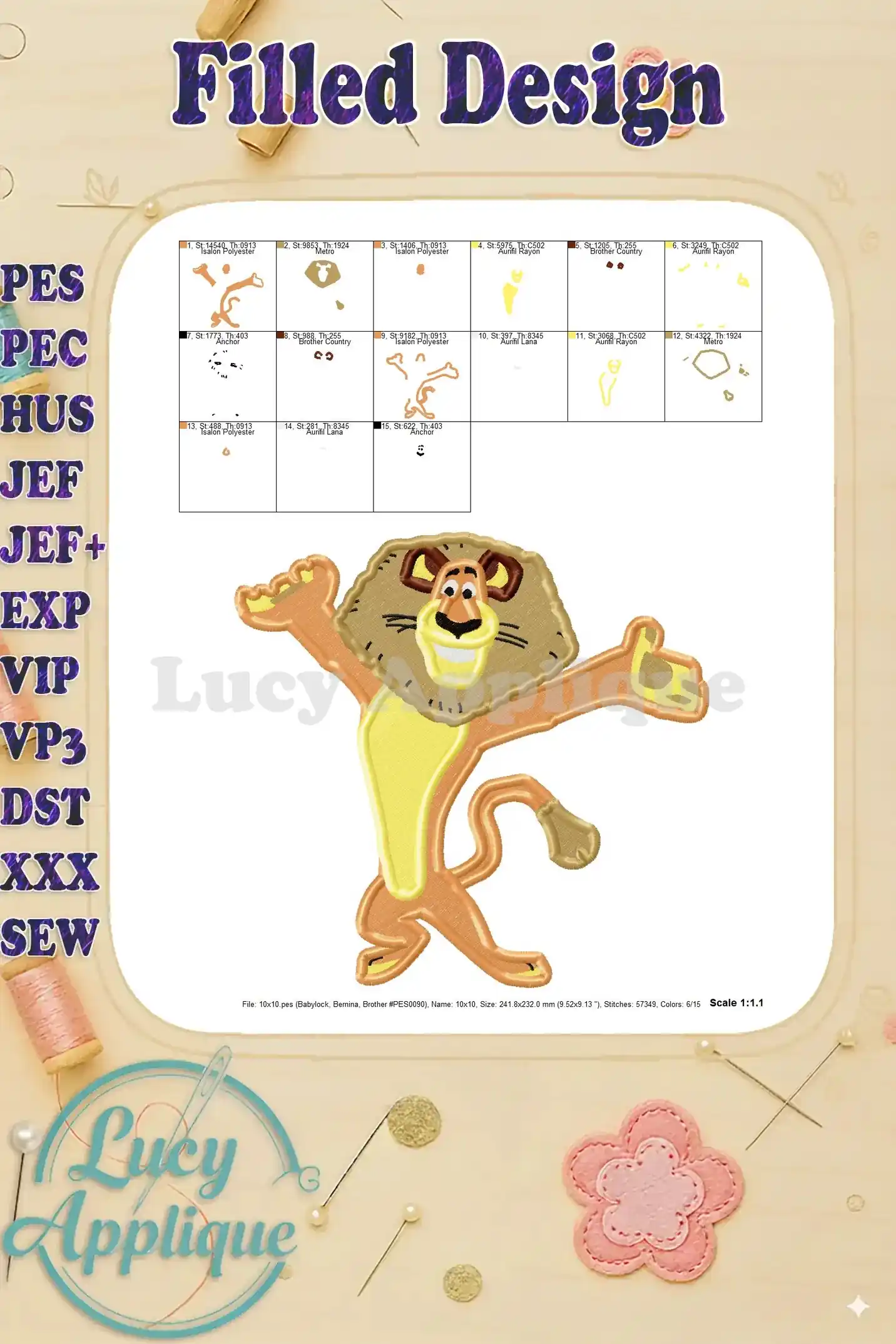 Adorable Alex the Lion from Madagascar! This filled embroidery design is perfect for adding a playful touch to your projects. Download includes multiple file formats and worksheets for easy use.