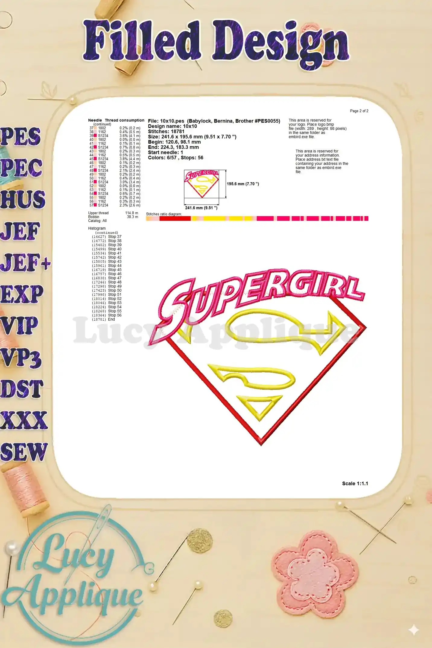 Embroider a vibrant Supergirl applique! This design is perfect for adding a superhero touch to your projects. High-quality design, easy to stitch.