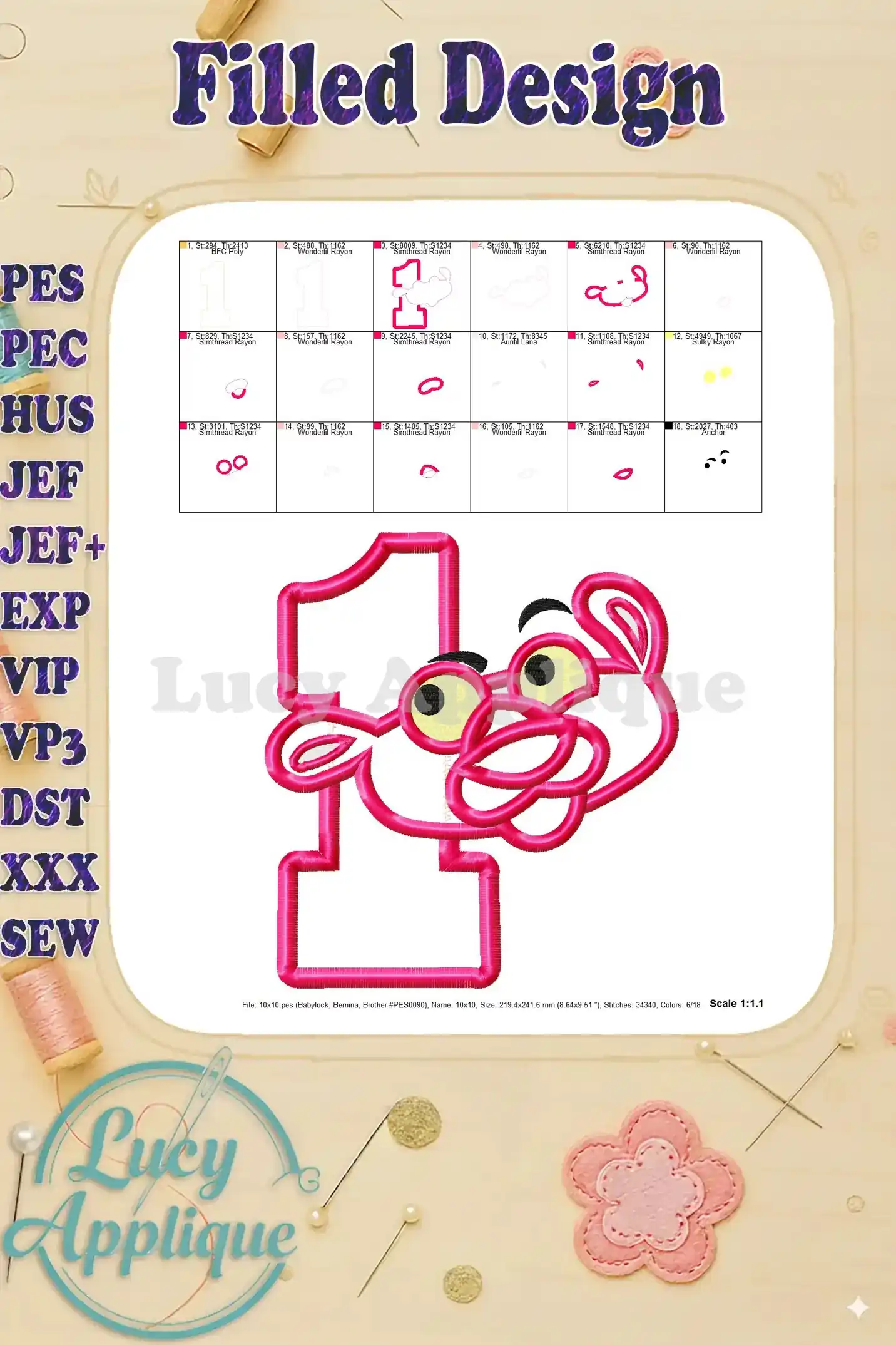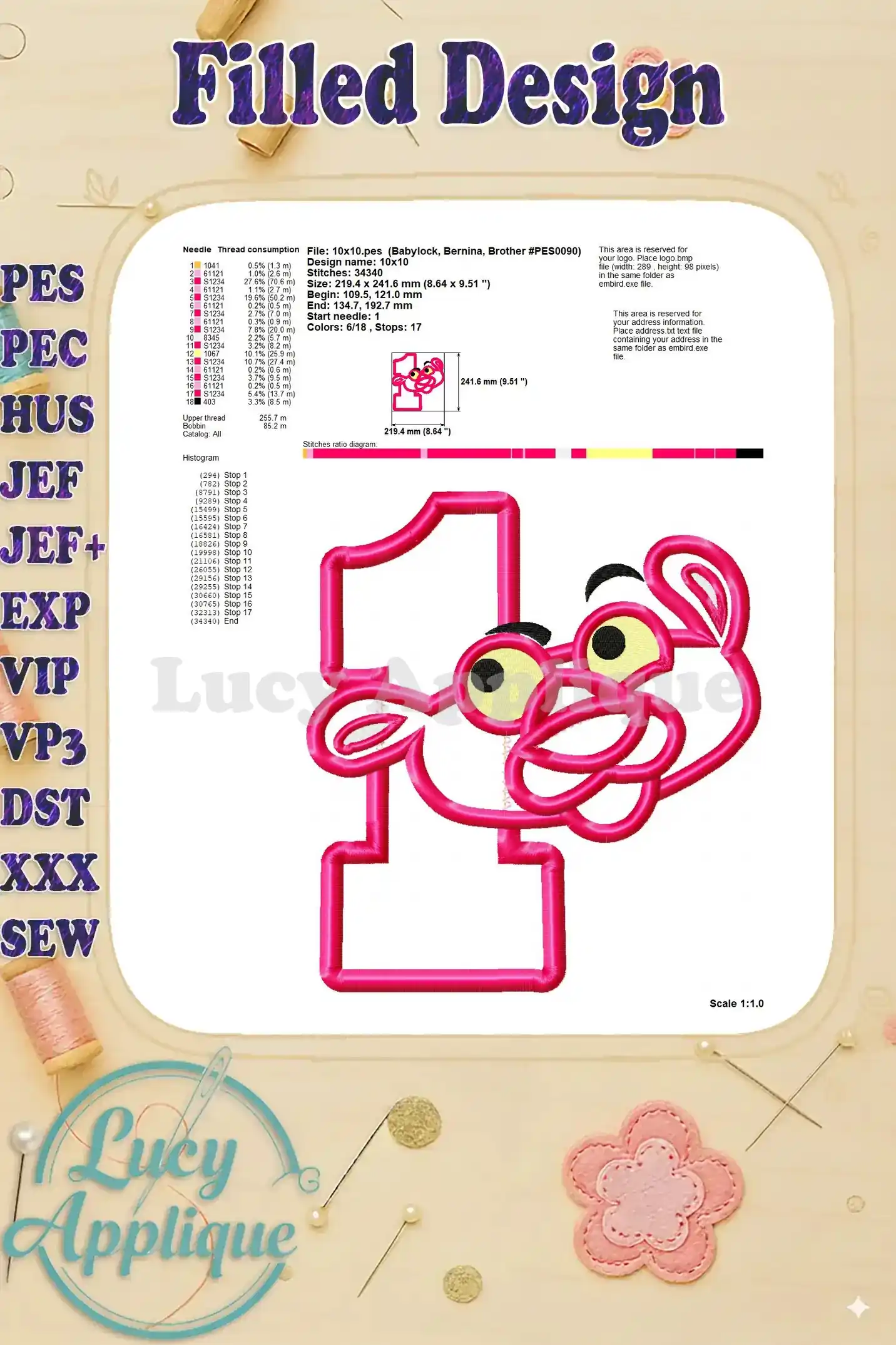 Adorable Baby Pink Panther 1st birthday applique embroidery design! Perfect for DIY projects, this design is easy to use and adds a touch of fun to any garment or accessory. High-quality digital file.
