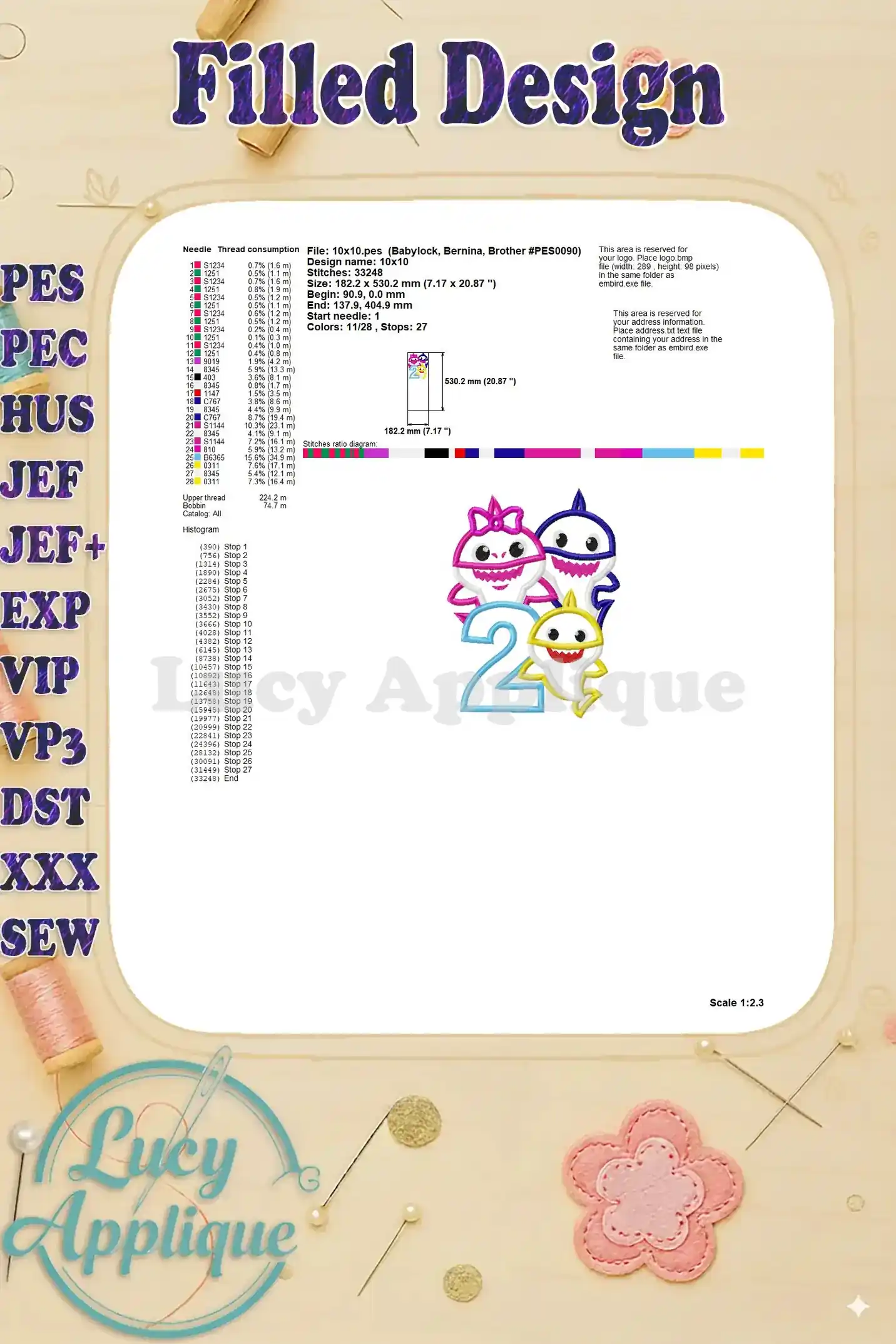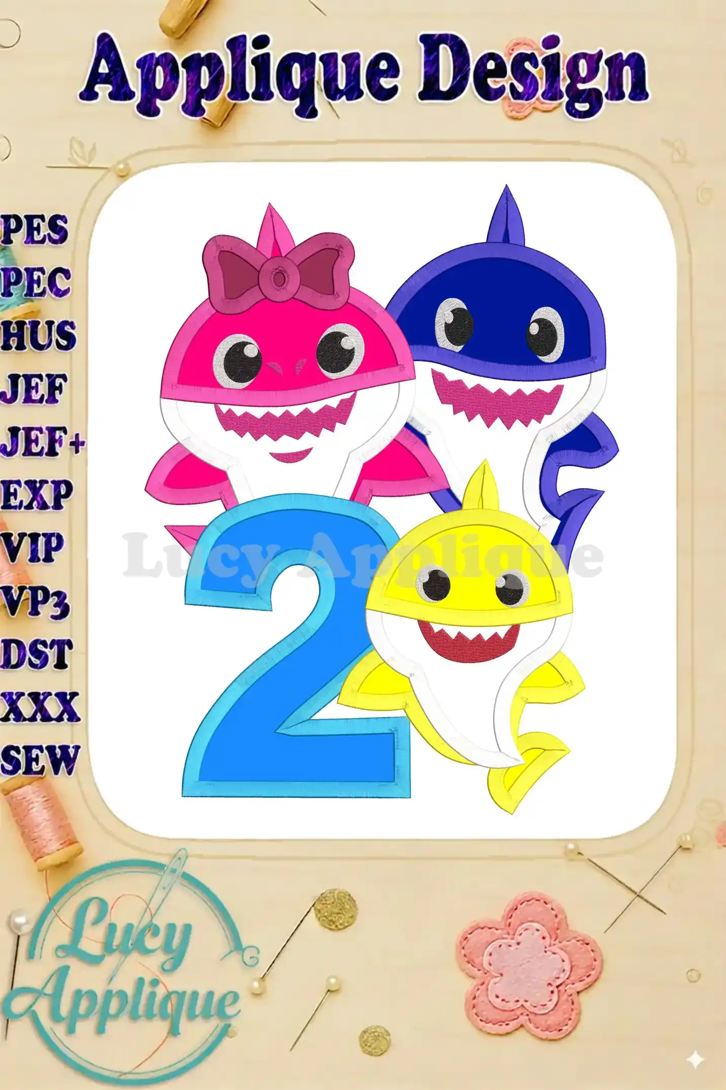 Baby Shark Birthday Number 2 Applique Embroidery Design – Instant Download