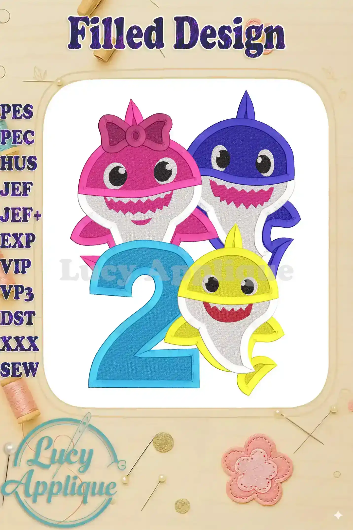 Baby Shark Birthday Number 2 Fill Machine Embroidery Design – Instant Download