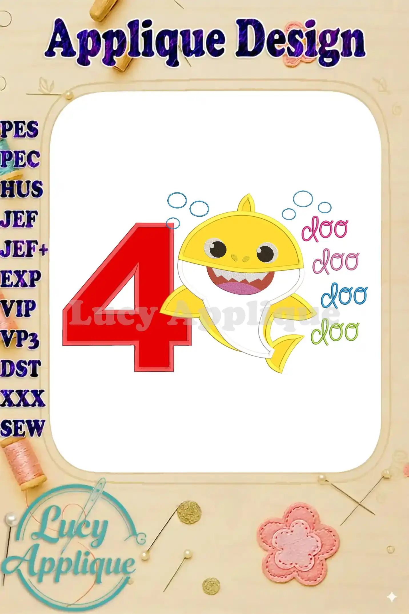 Baby Shark doo doo doo doo Birthday Number 4 Applique Embroidery Design – Instant Download