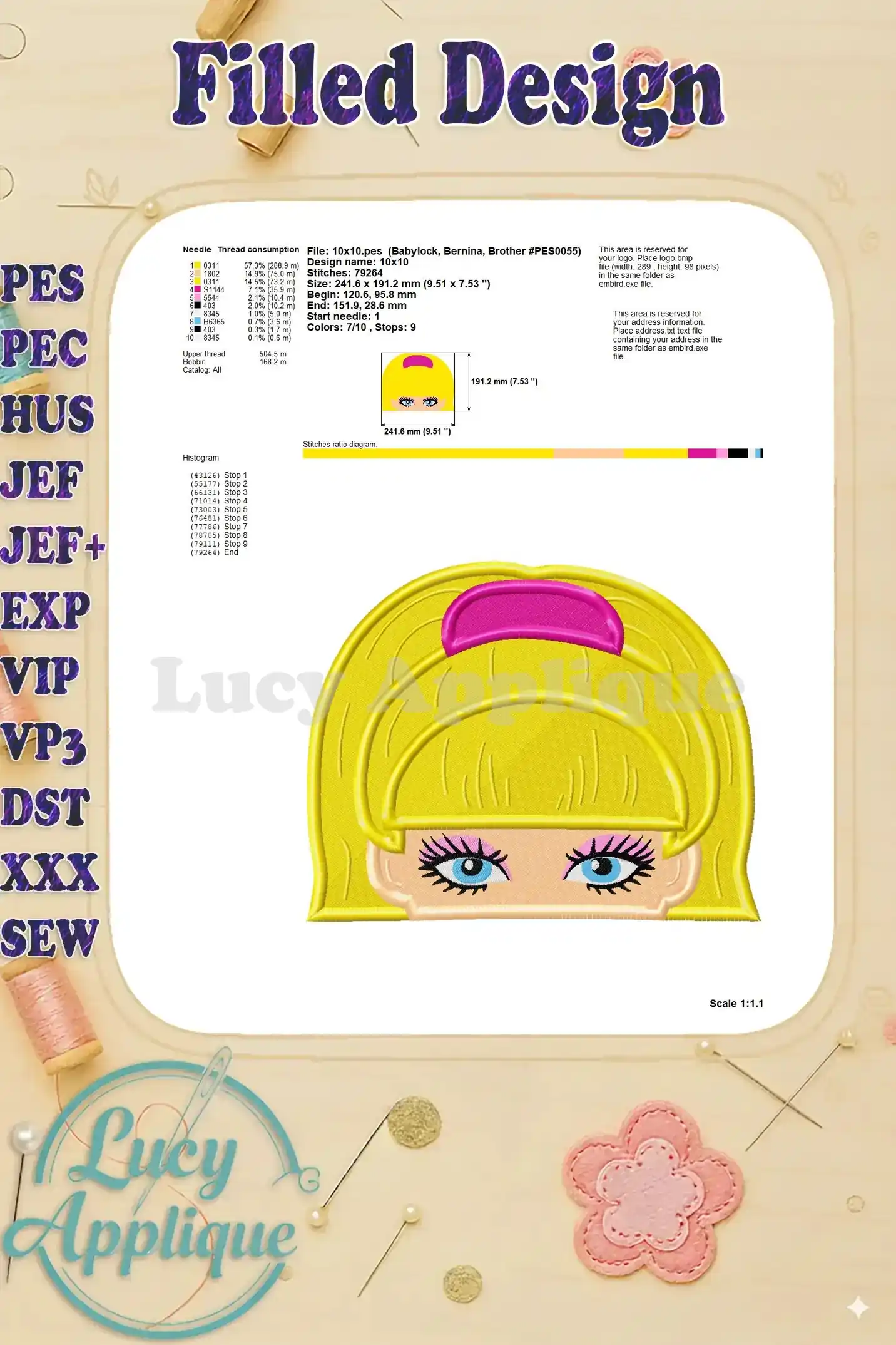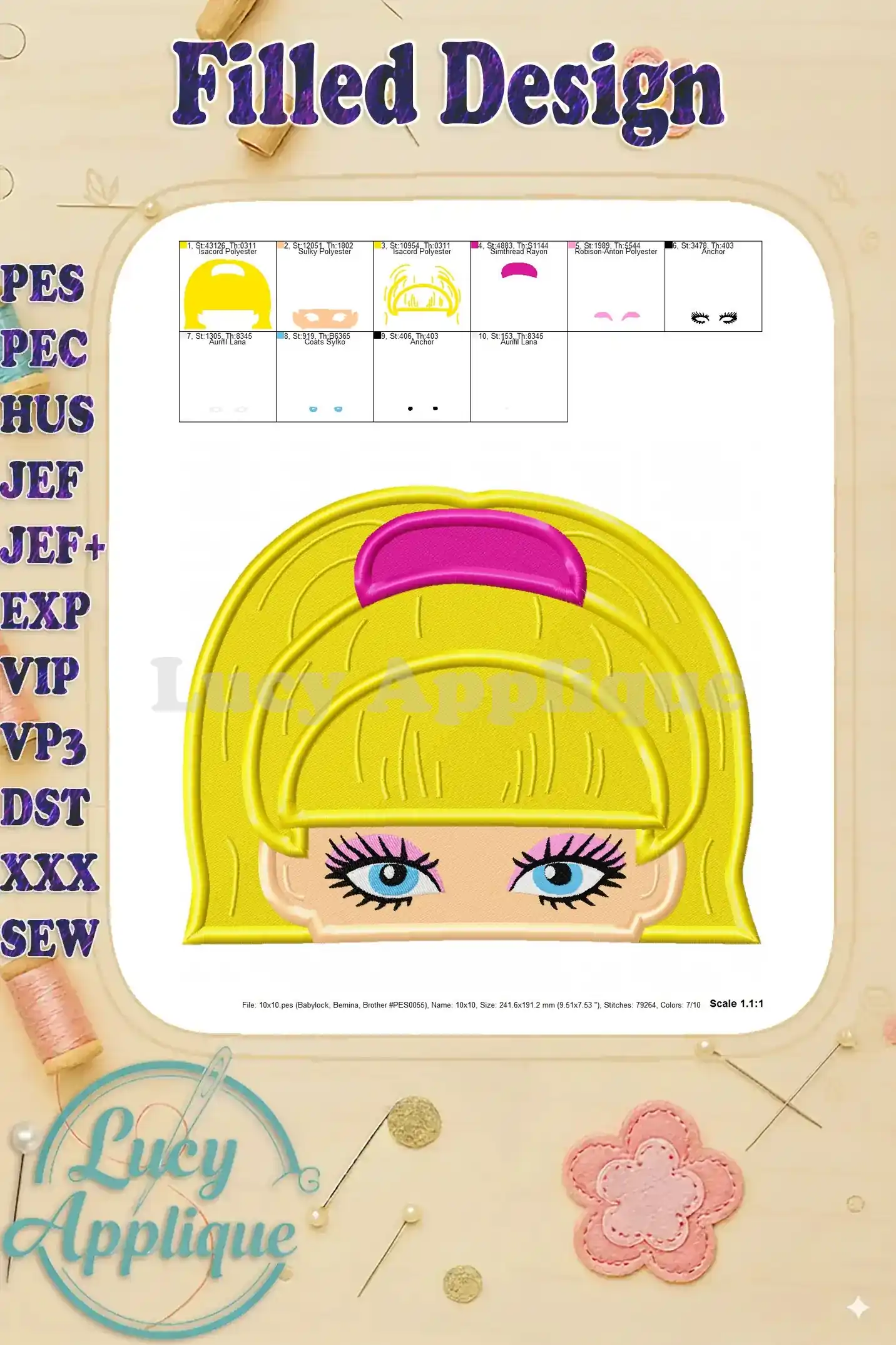 Adorable Barbie fill machine embroidery design! Perfect for adding a touch of retro fun to your projects. High-quality design, easy to use. Download now!