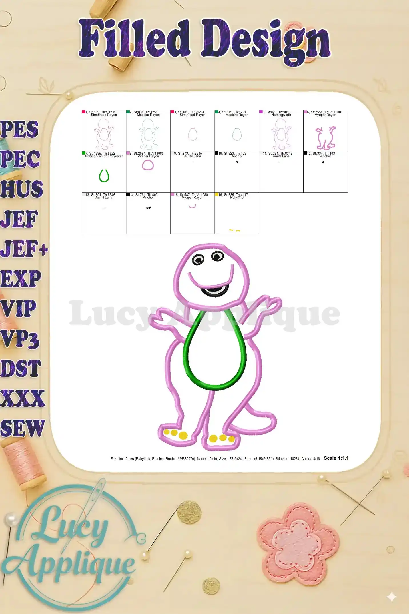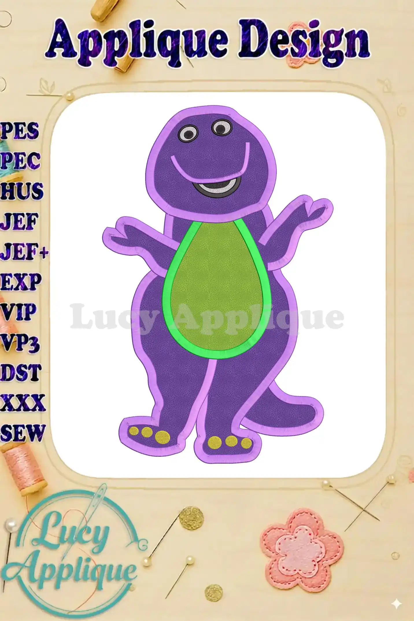 Adorable Barney applique embroidery design! Perfect for kids’ clothes, blankets, or crafts. Easy-to-follow instructions and multiple formats included. Download now!