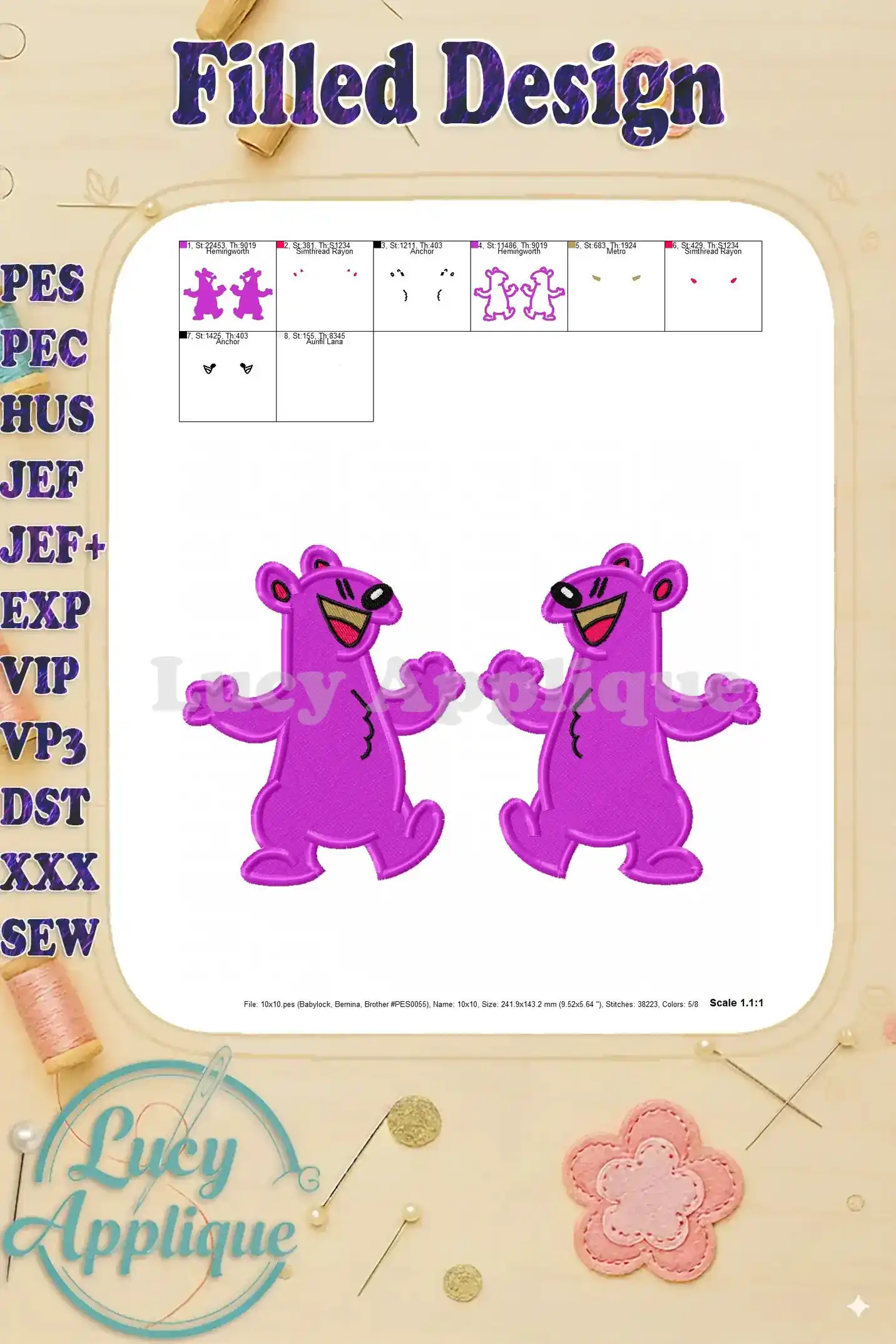 Adorable Pip and Pop bear embroidery design! Perfect for applique projects, this filled design is easy to stitch and adds a touch of playful charm to any creation.