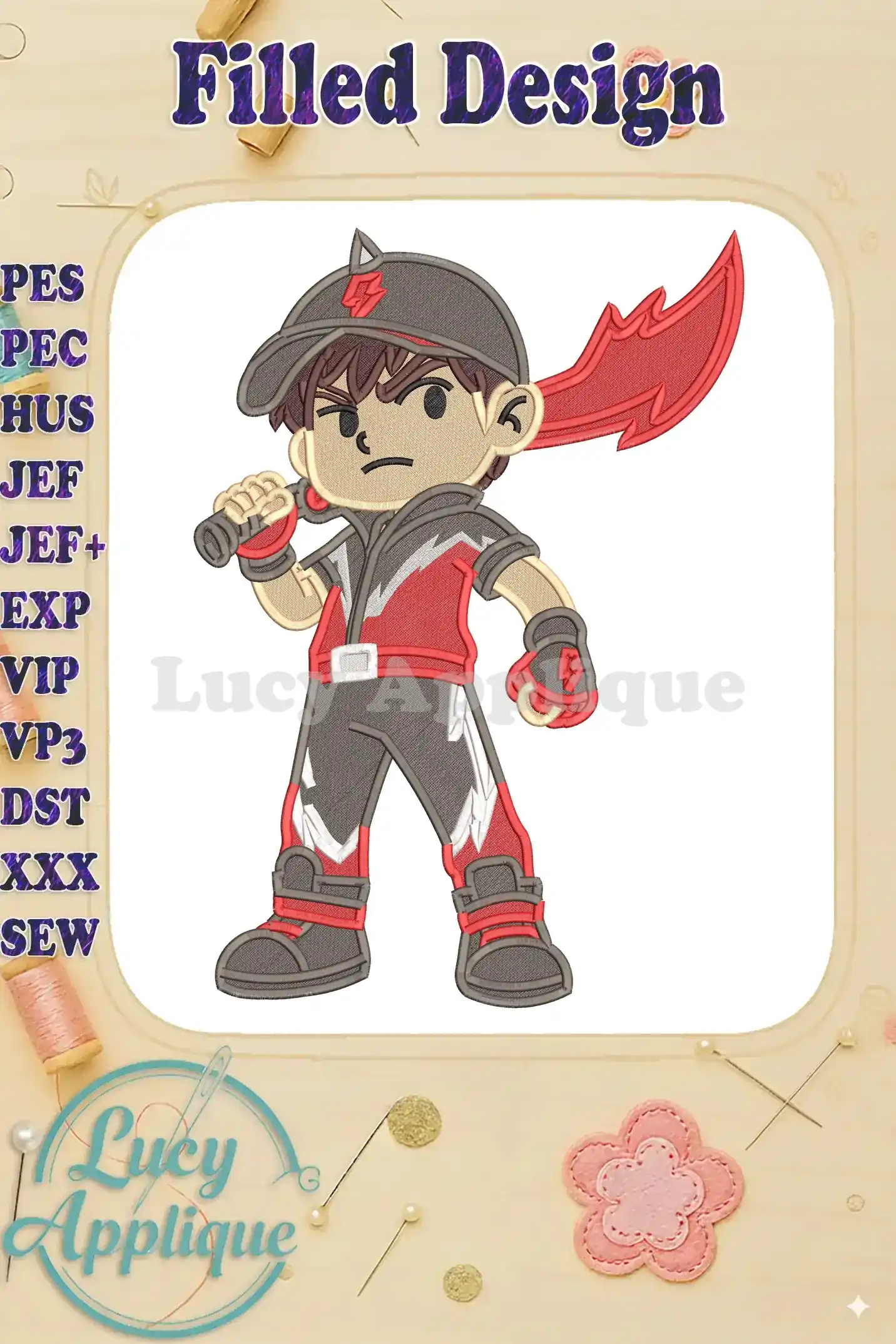 BoBoiBoy character with red sword fill embroidery designs