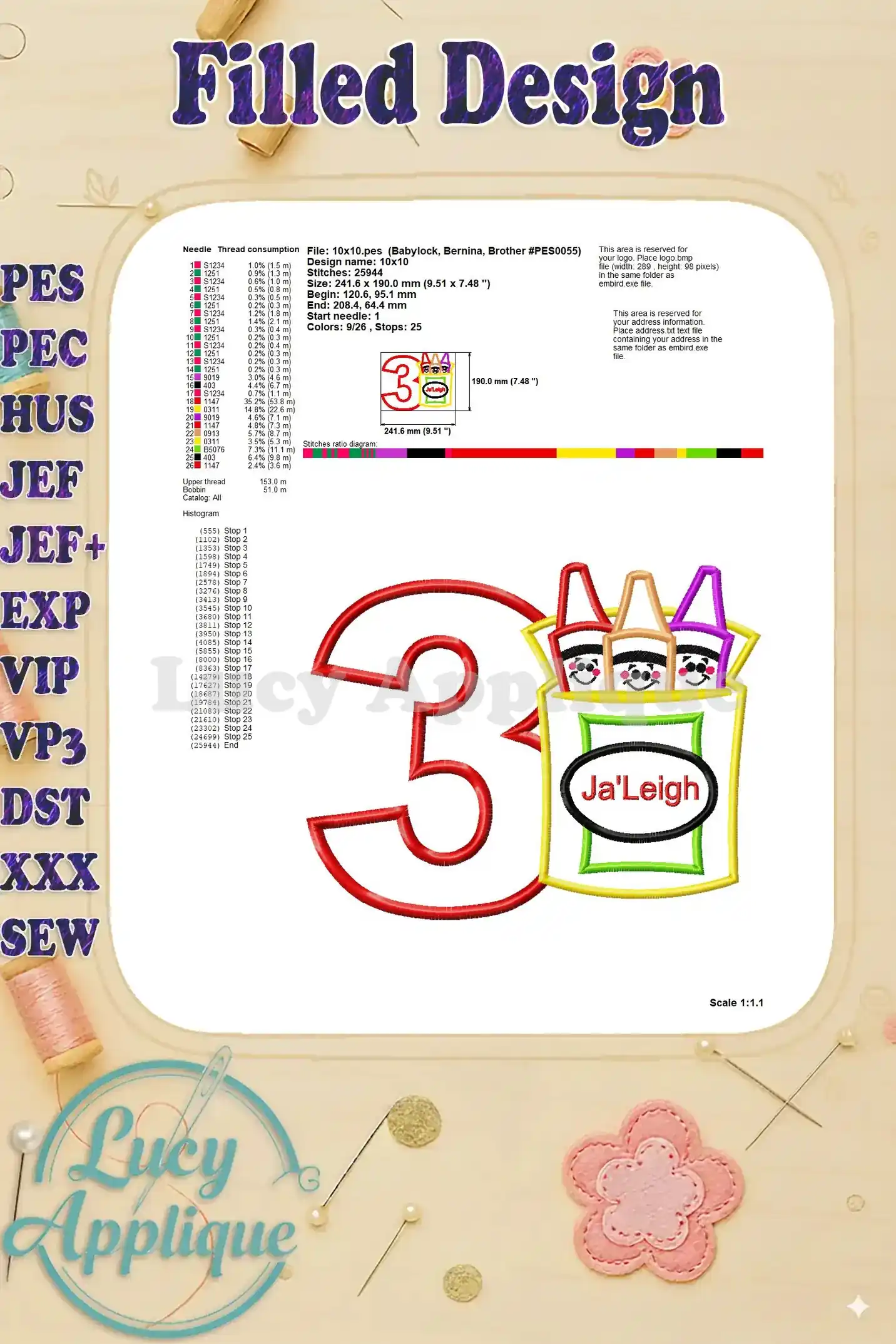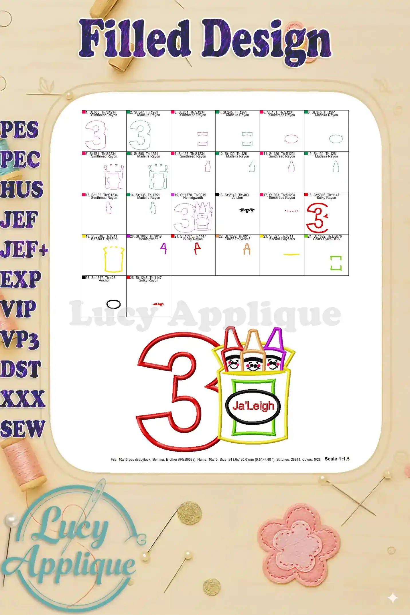 Box of Crayons Applique Birthday Number 3 Ja’Leigh Embroidery Design – Instant Download