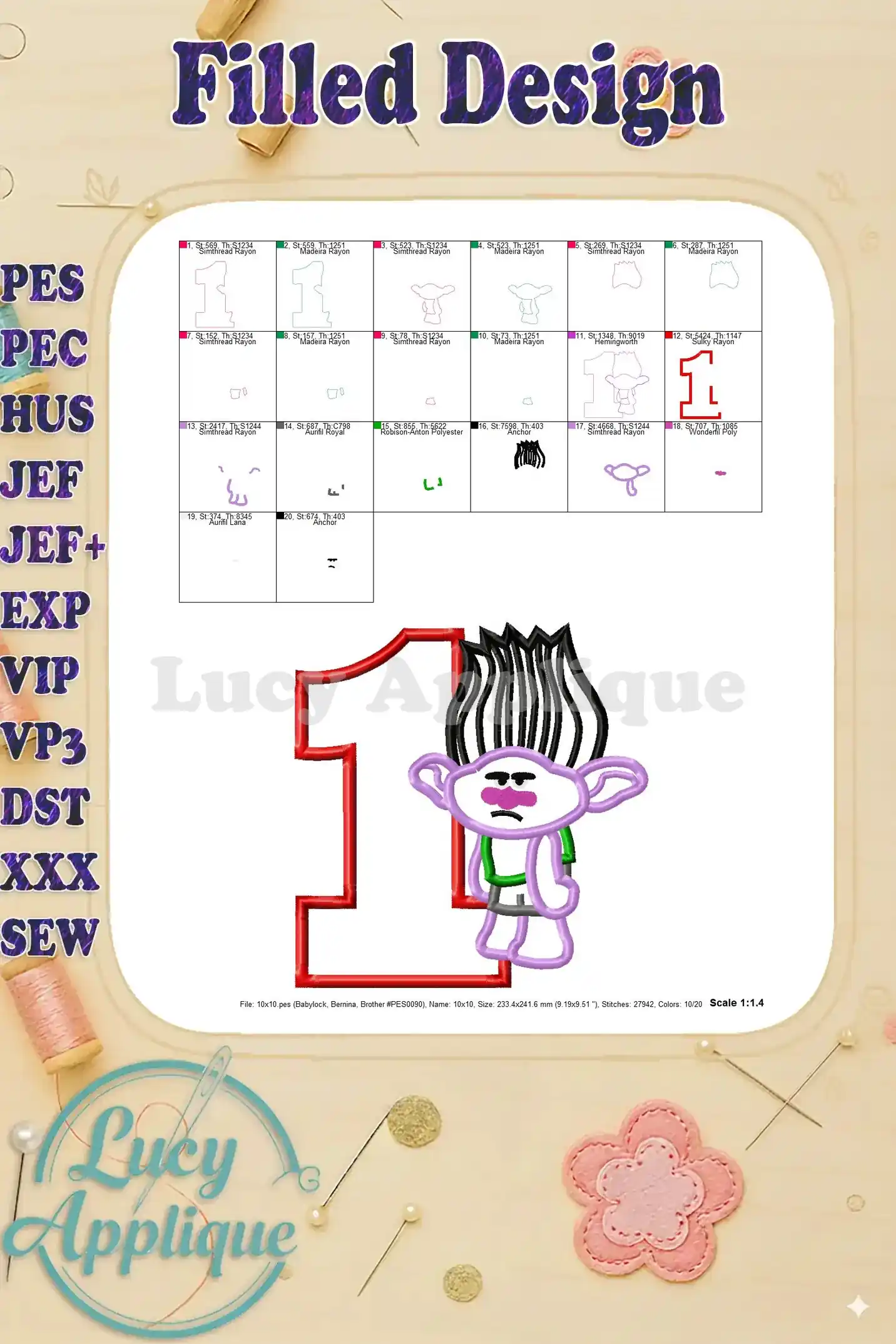 Branch Trolls Birthday Number 1 Applique Embroidery Design – Instant Download