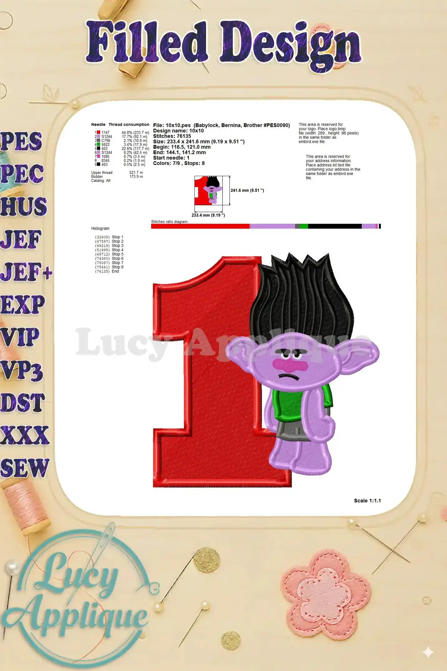 Branch Trolls Birthday Number 1 Fill Machine Embroidery Design – Instant Download