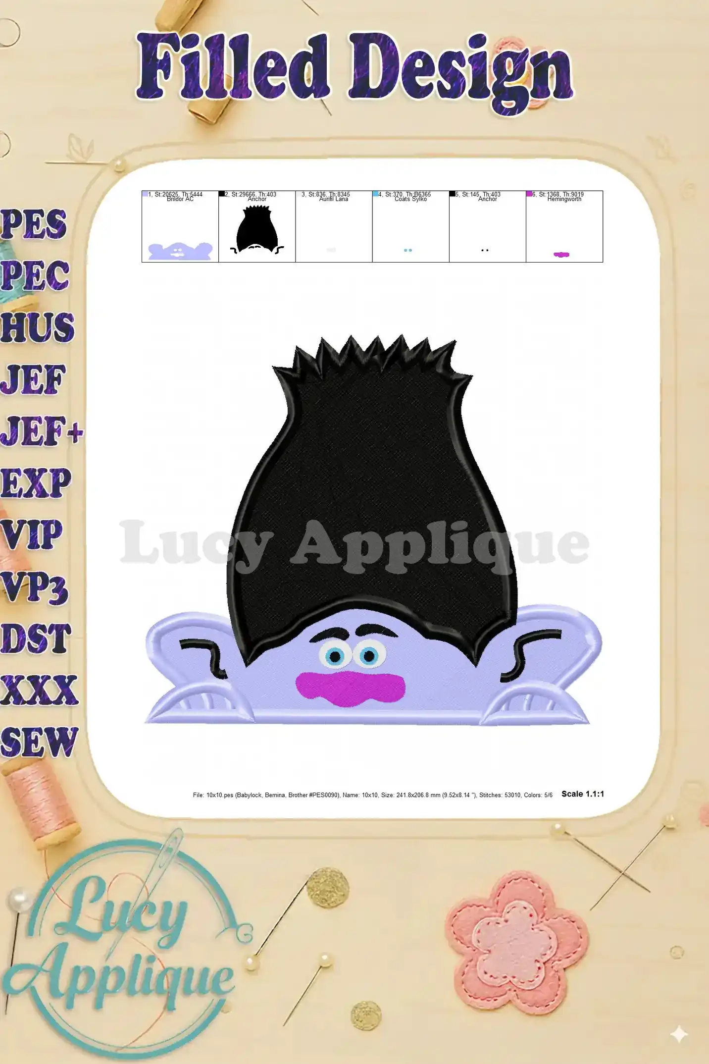 Adorable Branch Troll embroidery design! Perfect for adding a fun, whimsical touch to your projects. High-quality design, easy to stitch.