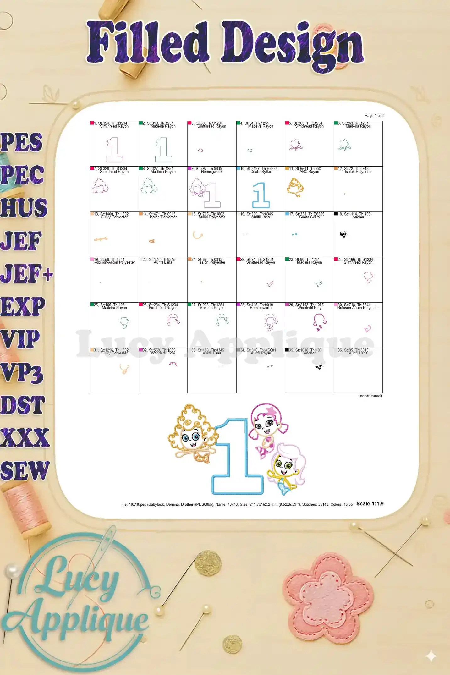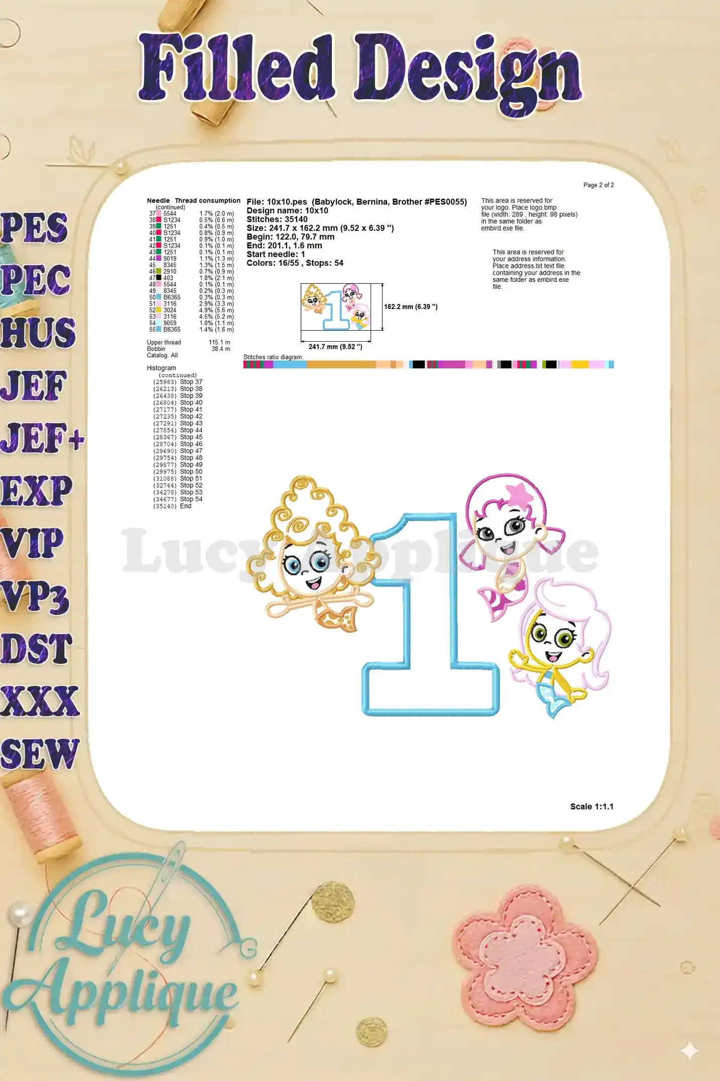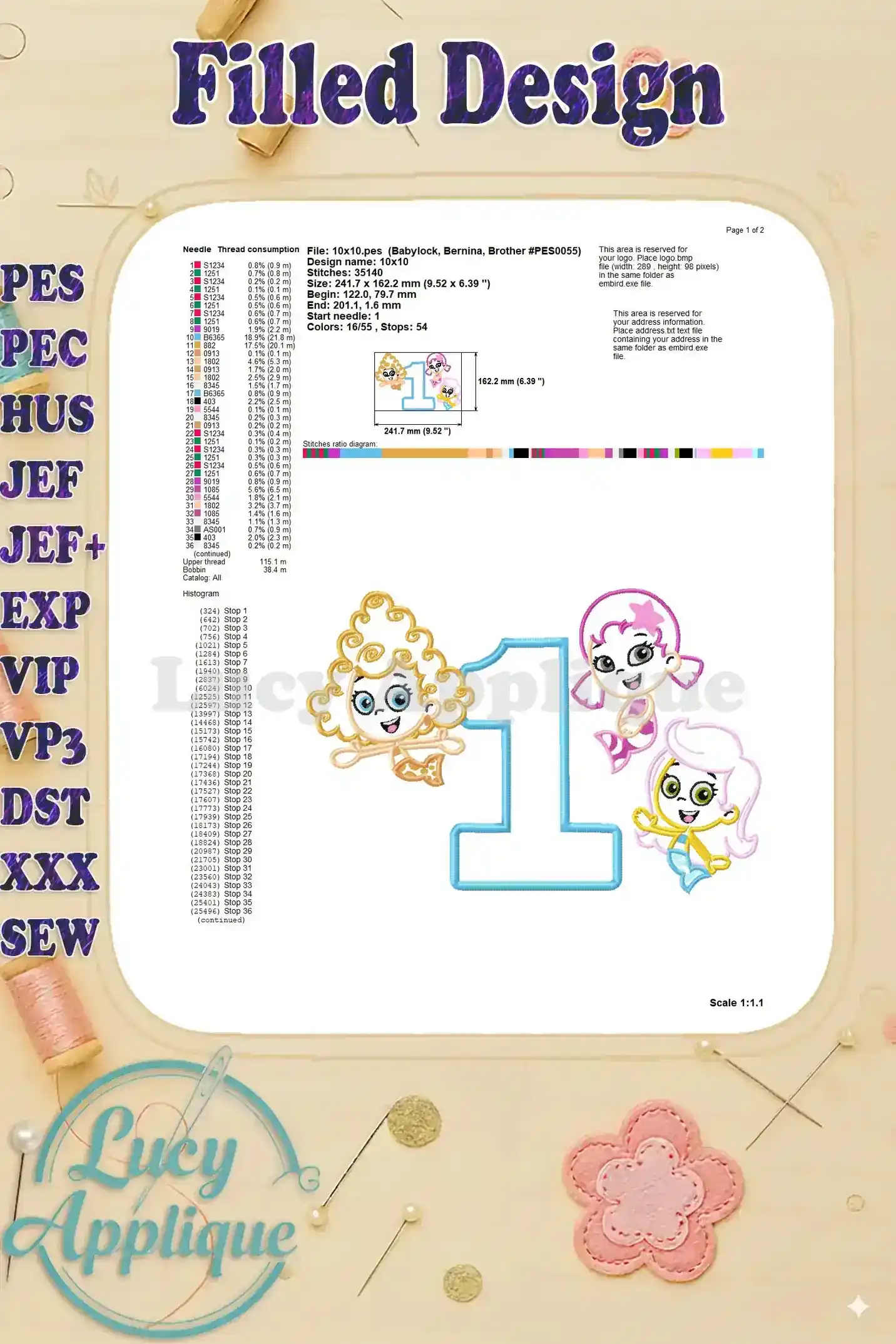 Bubble Guppies Deema With Oona and Molly Birthday Number 1 Applique Embroidery Design – Instant Download