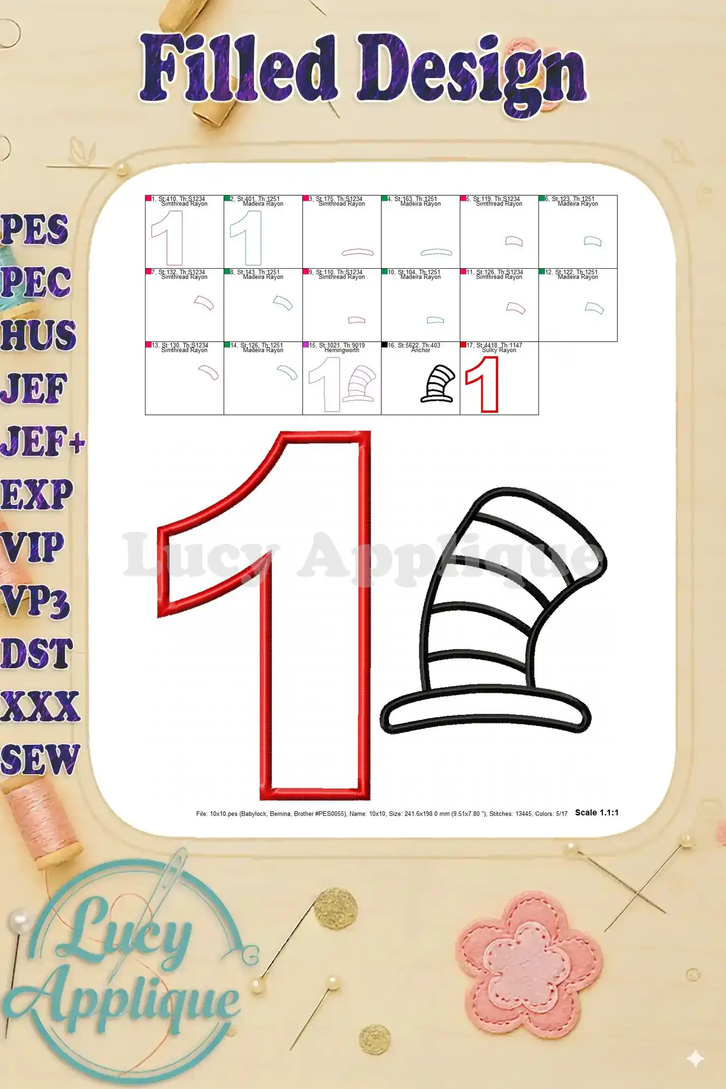 Cat in the Hat Birthday Number 1 Applique Design – Instant Download