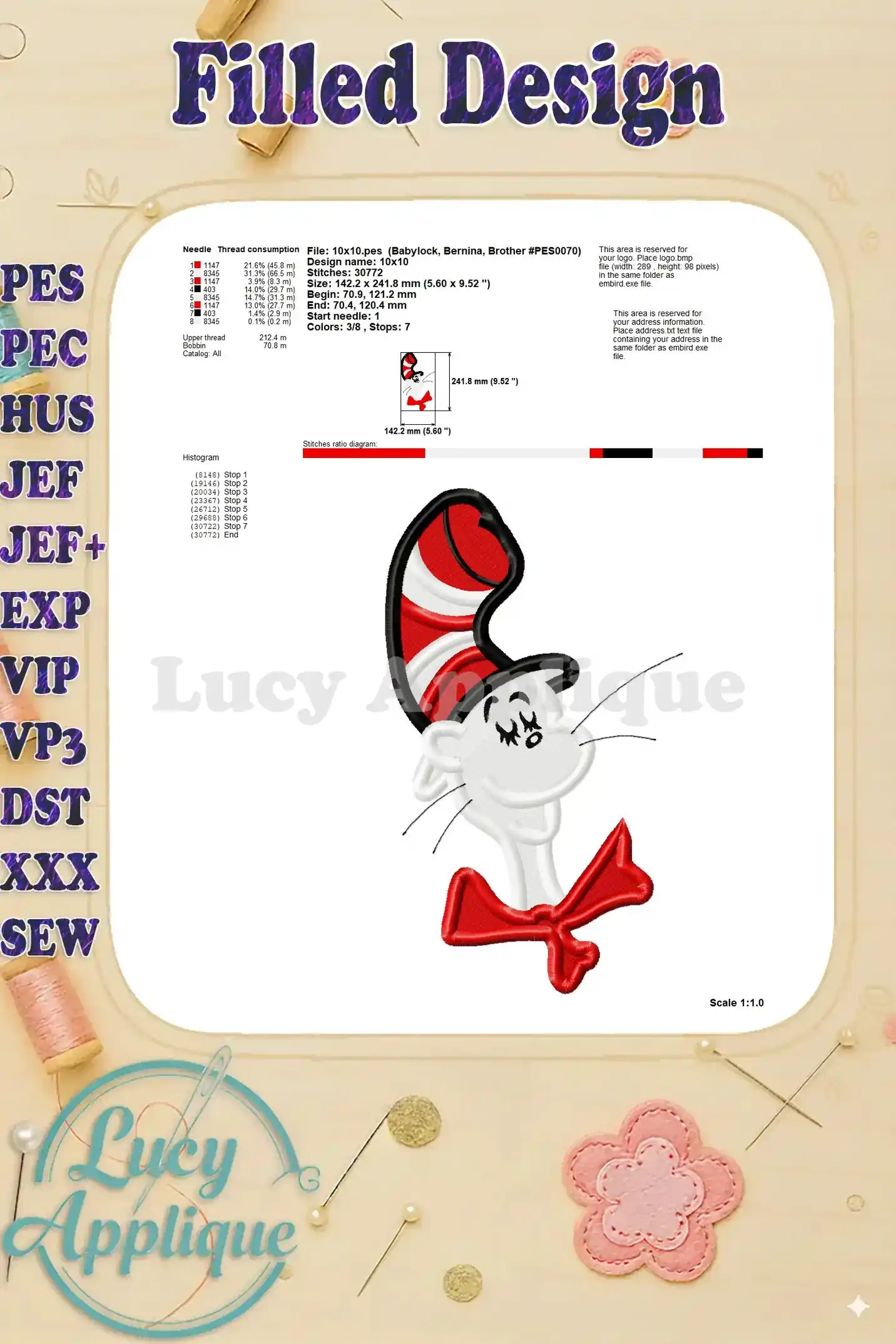 Cat in the Hat Dr Seuss Happy Head Filled Embroidery Design – Instant Download