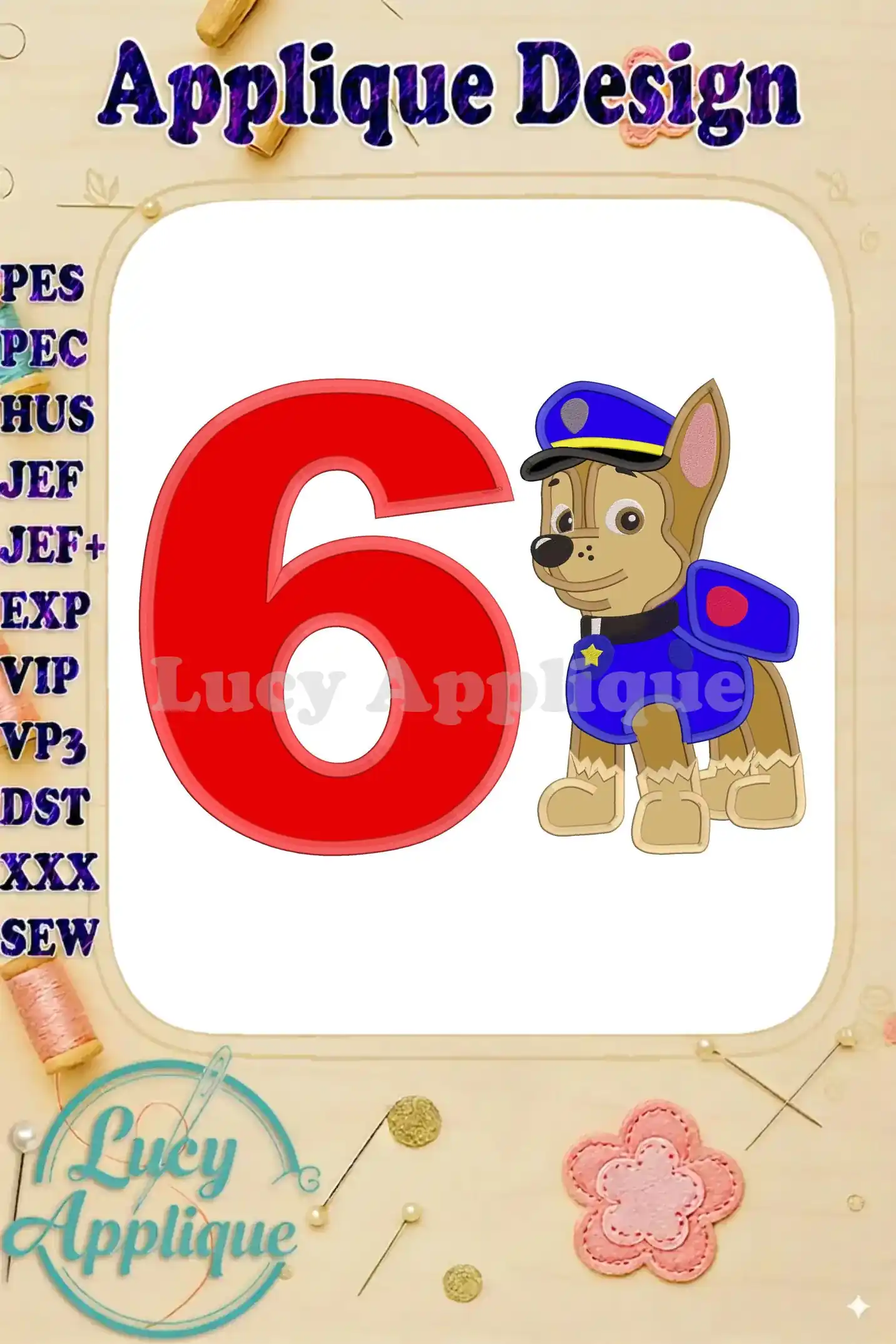 Celebrate your child’s 6th birthday with this adorable Chase Paw Patrol applique design! Perfect for adding a personalized touch to their party clothes or a special gift.