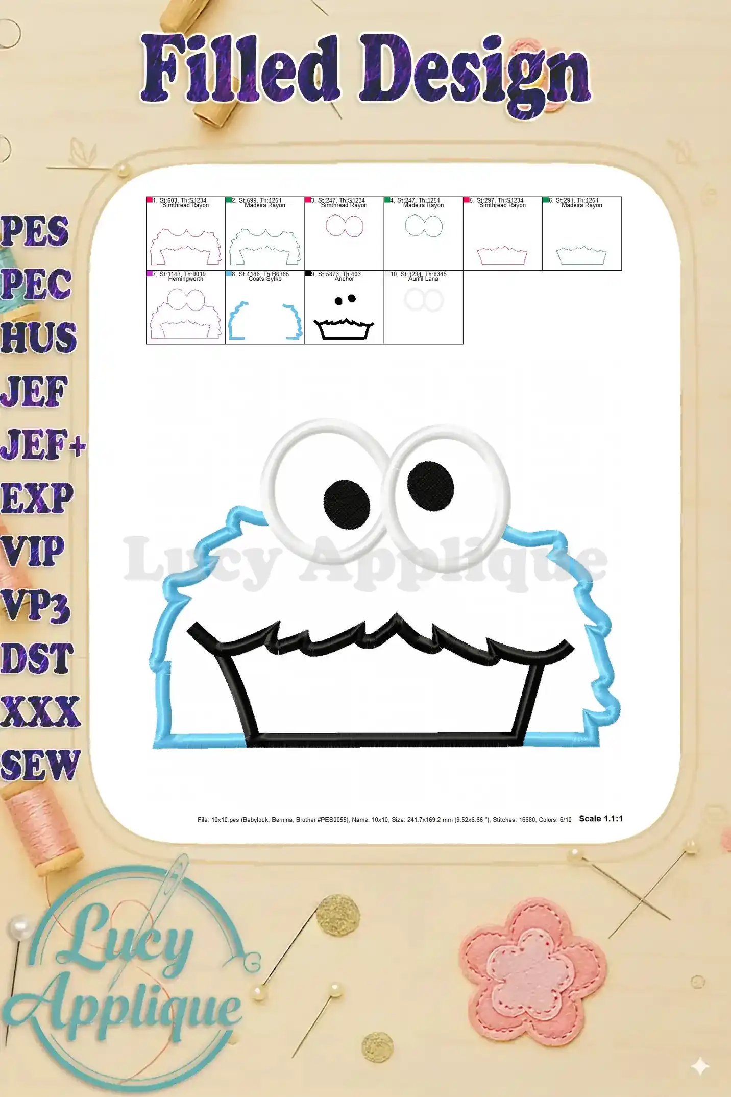 Adorable Cookie Monster applique embroidery design! Perfect for kids’ clothes, bags, or home decor. Easy-to-follow instructions and multiple formats included. Add a fun, playful touch to your projects!