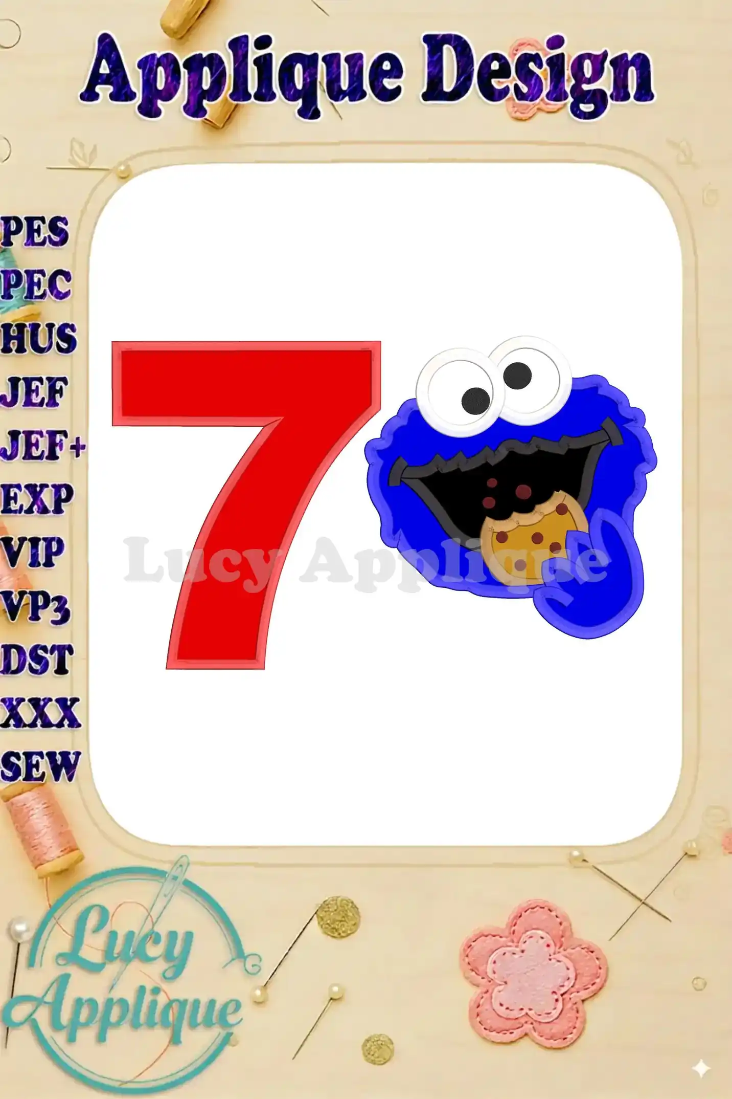 Cookie Monster Head Birthday Number 7 Applique Design – Instant Download