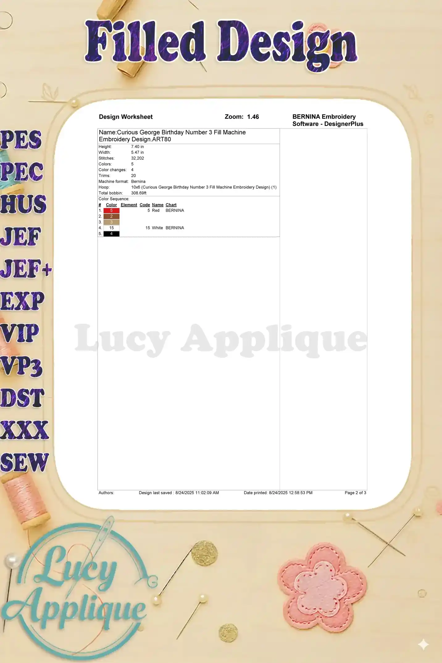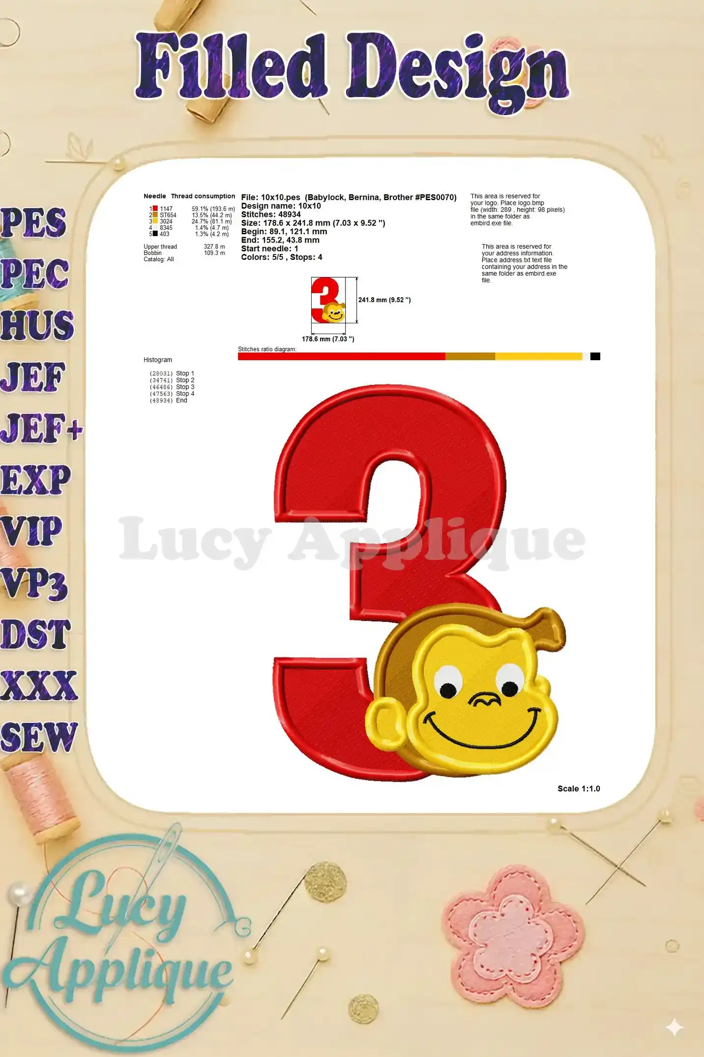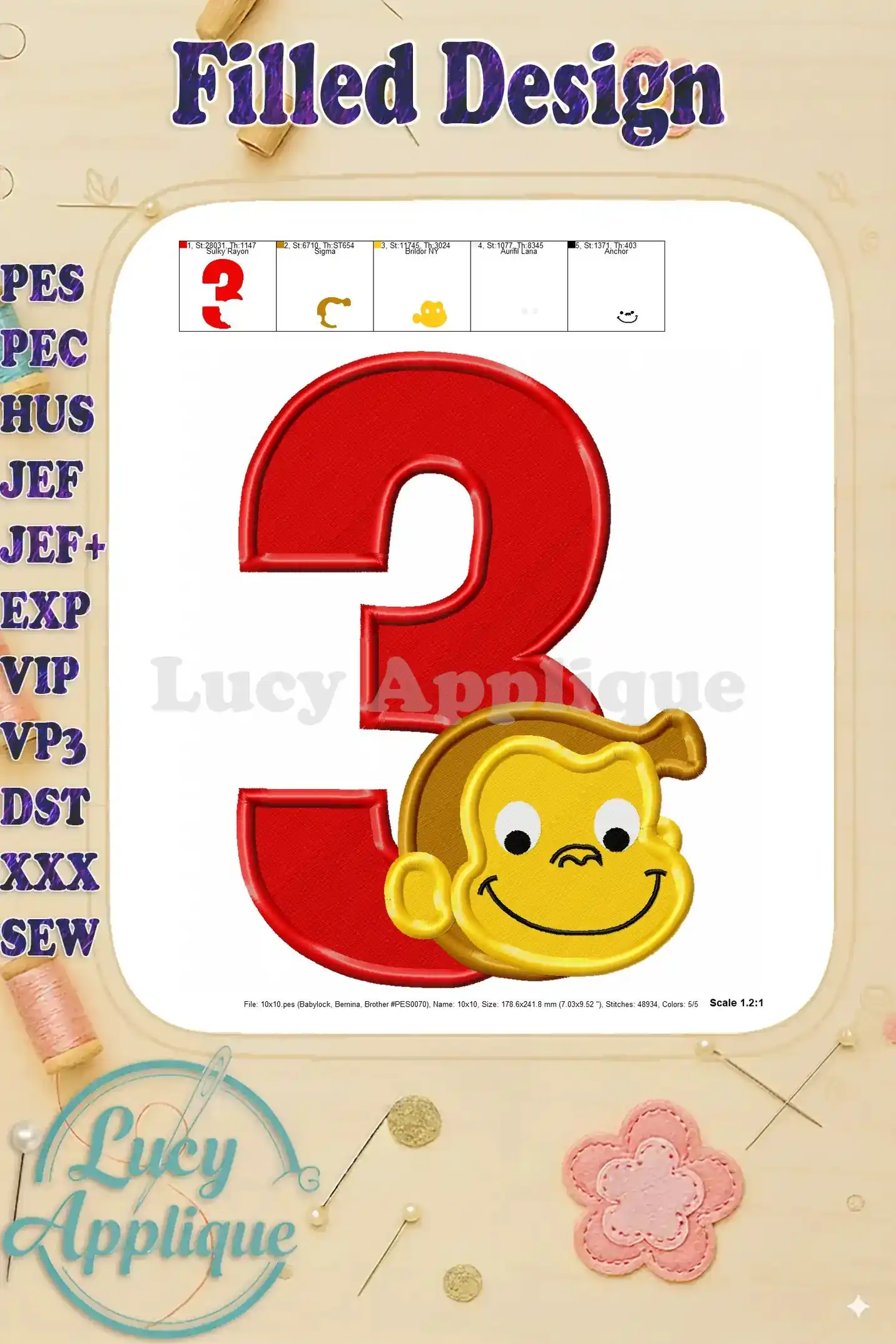 Curious George Birthday Number 3 Fill Machine Embroidery Design – Instant Download