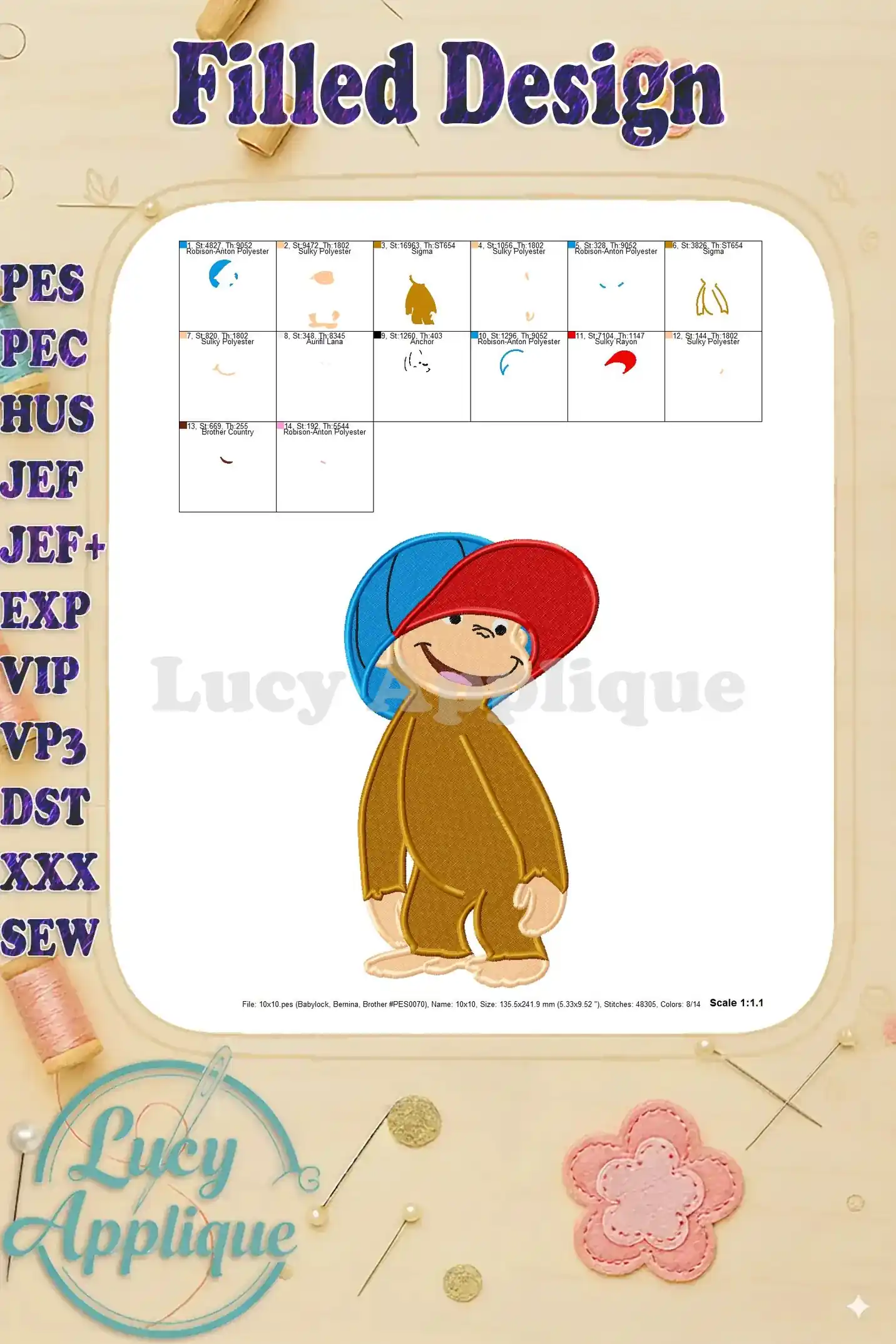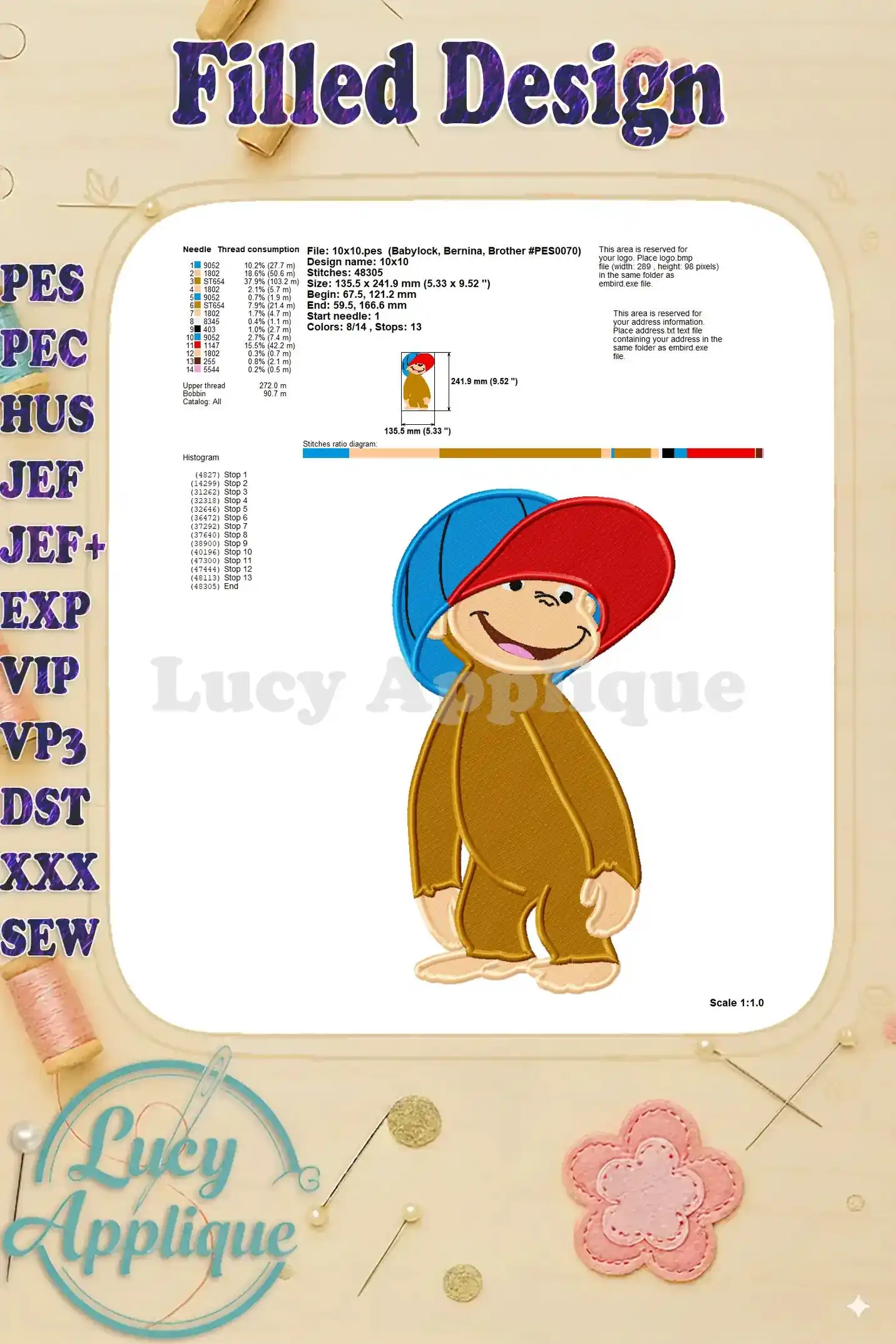 Adorable Curious George filled embroidery design! Perfect for adding a playful touch to clothes, bags, or home decor. High-quality design with detailed stitching.