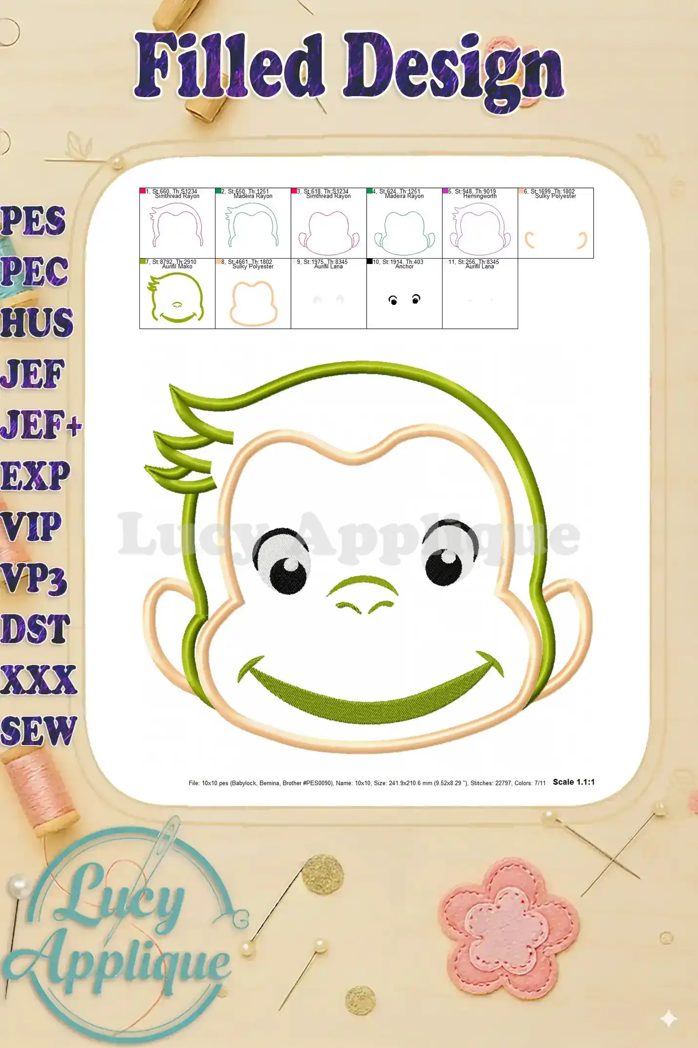 Curious George Full Head Applique Embroidery Design – Instant Download
