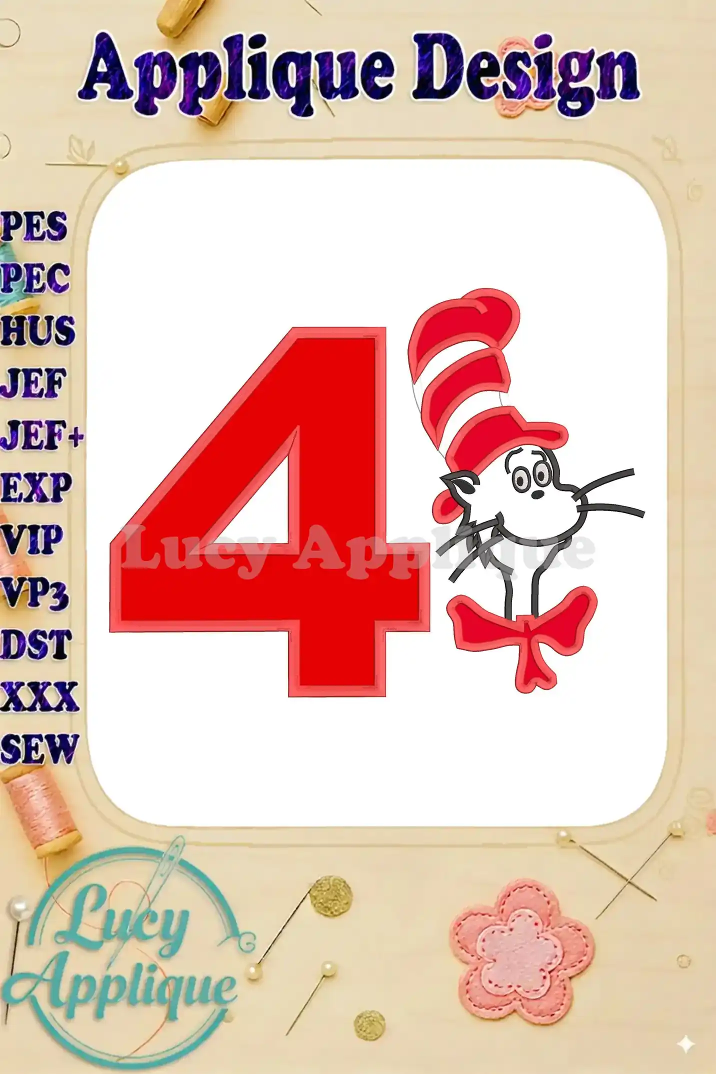 Dr Seuss Cat in The Hat Birthday Number 4 Applique 02 Design – Instant Download