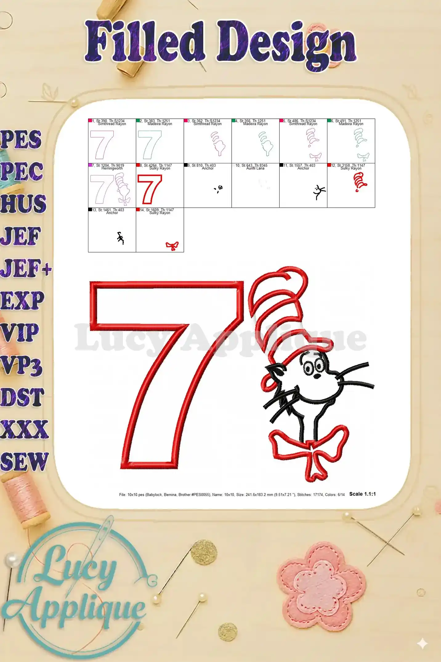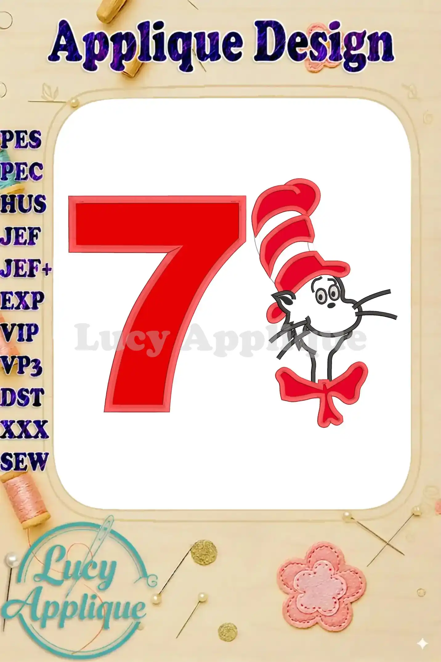 Dr Seuss Cat in The Hat Birthday Number 7 Applique 02 Design – Instant Download