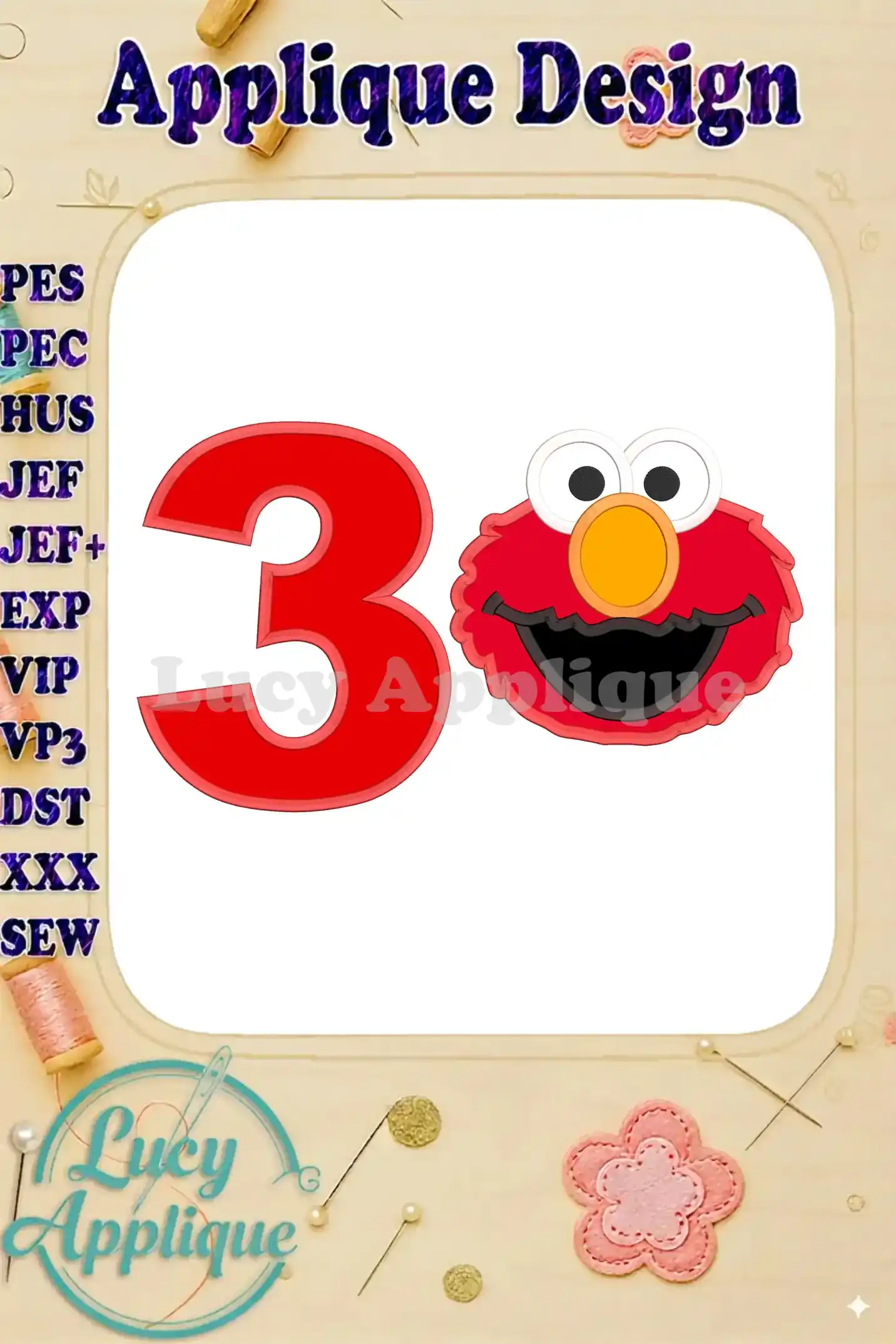 Elmo Head Birthday Number 3 Applique Design – Instant Download