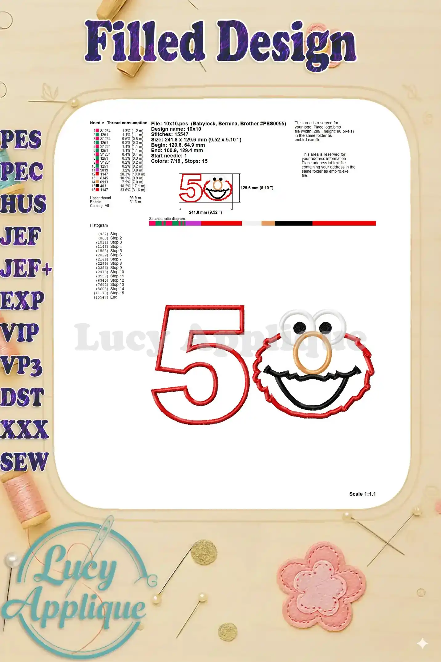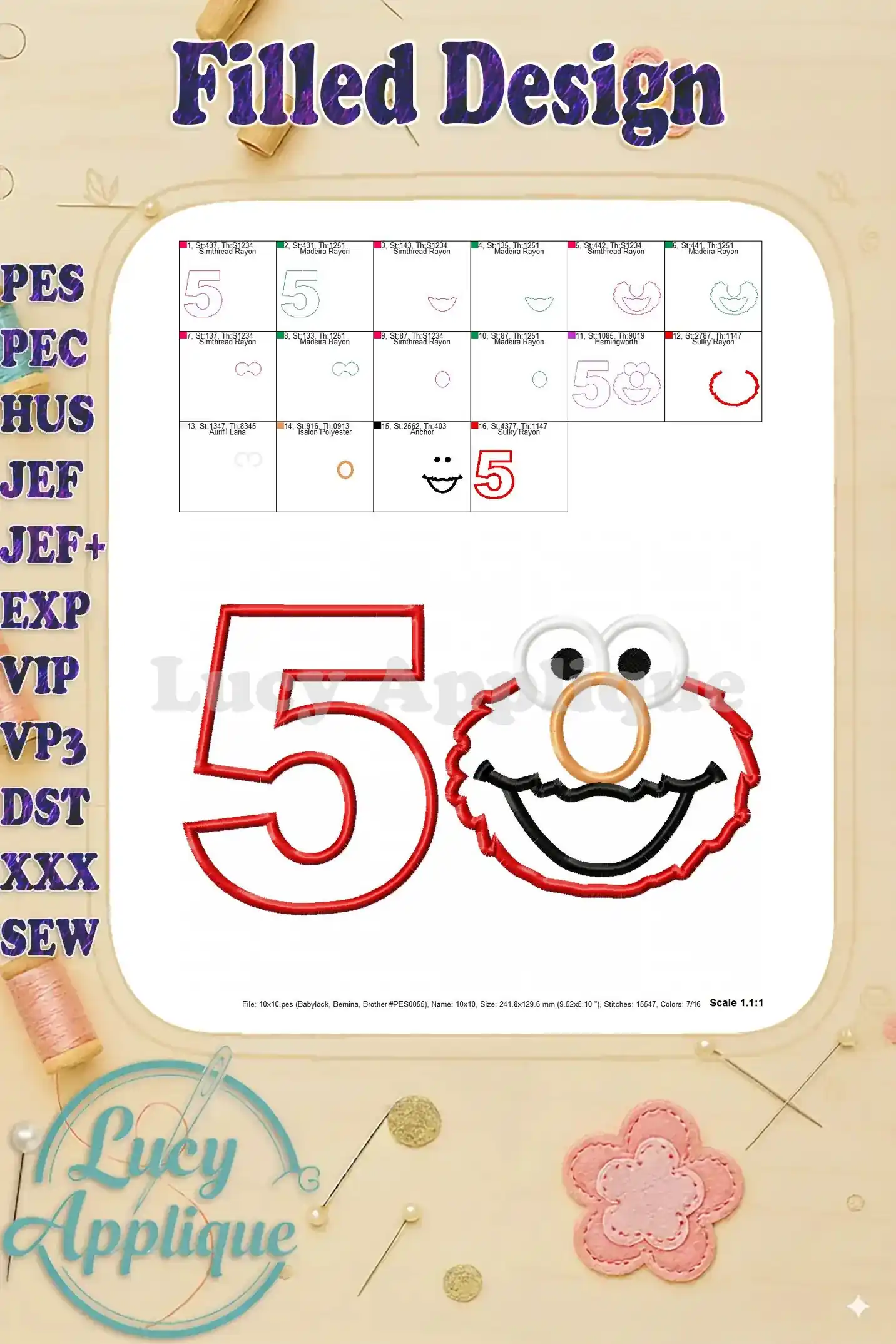 Elmo Head Birthday Number 5 Applique Design – Instant Download