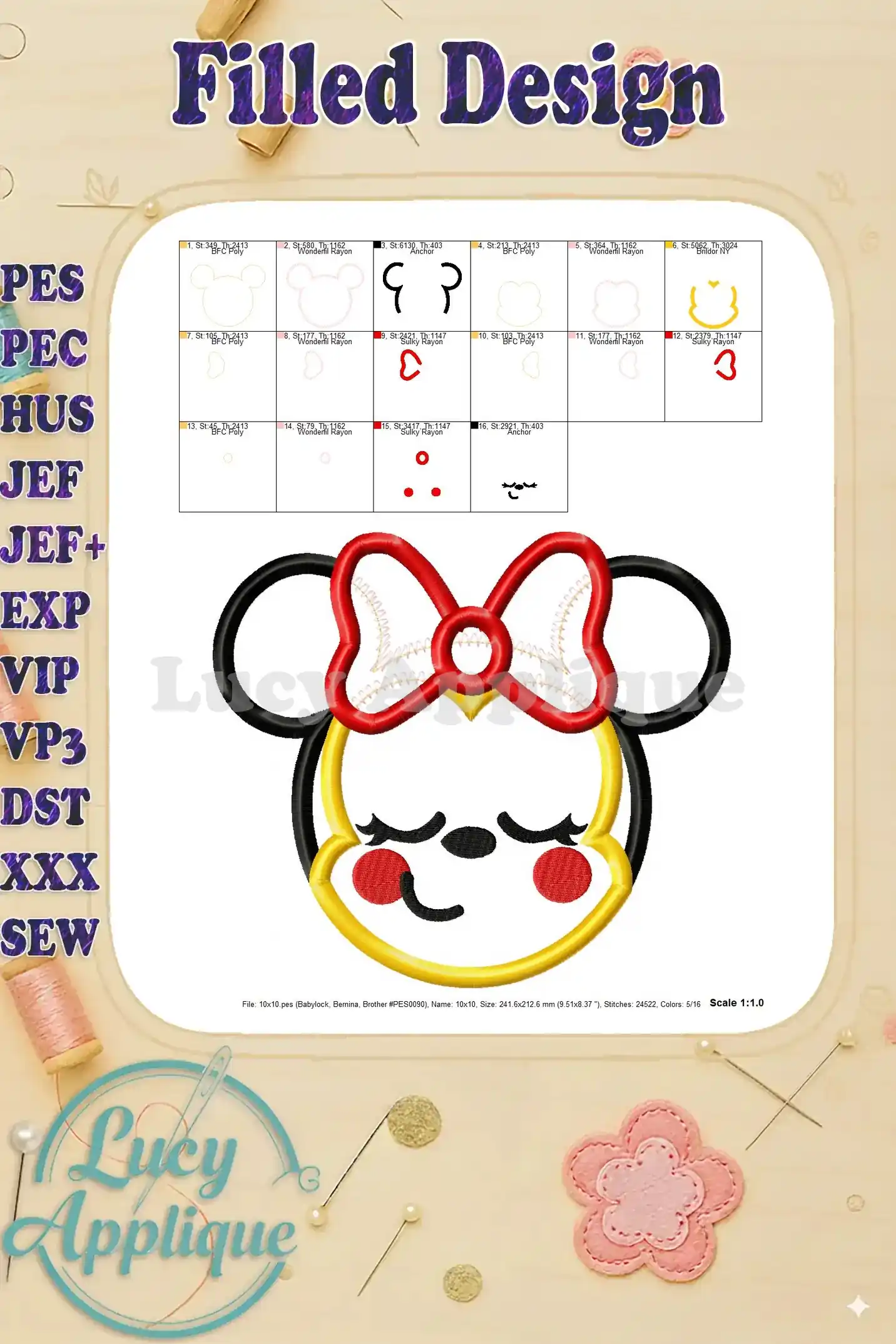 Adorable Emoji Minnie Mouse applique embroidery design! Perfect for adding a cute Disney touch to your projects. High-quality design with various file formats included.