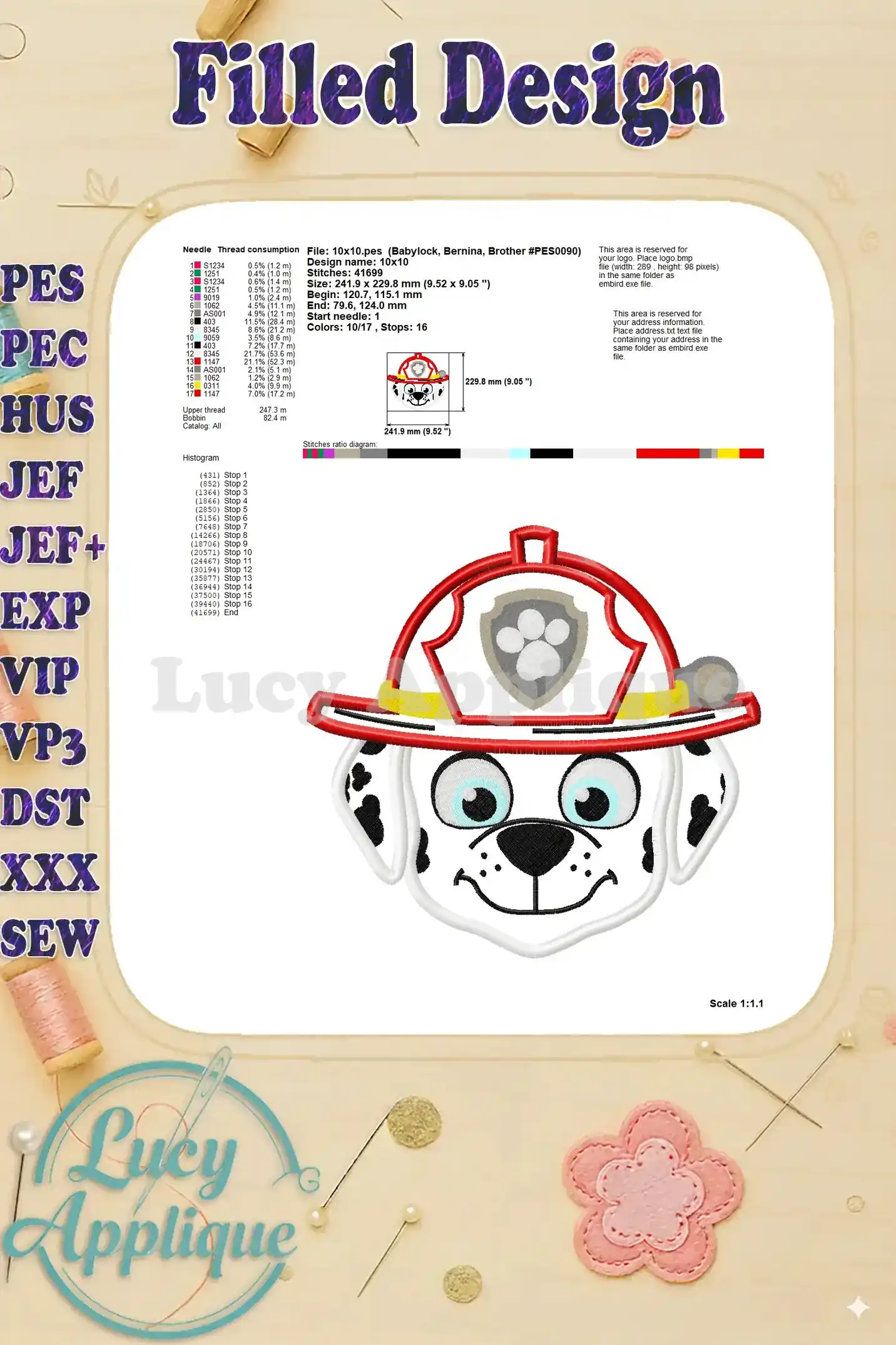 Face Marshall Paw Patrol Applique Embroidery Design – Instant Download