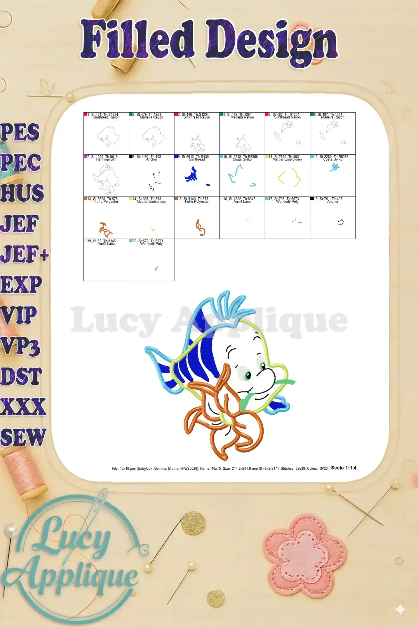 Adorable Flounder applique design from The Little Mermaid! Perfect for kids’ clothes, blankets, or home decor. Easy-to-follow instructions included. High-quality digital embroidery pattern.