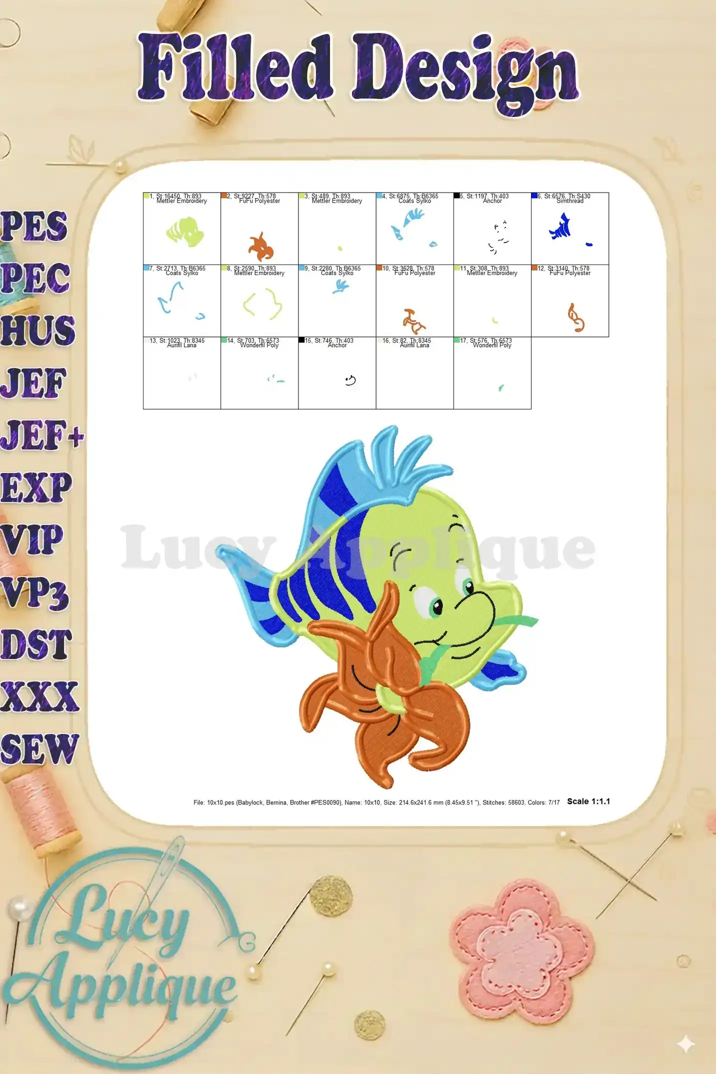 Adorable Flounder from The Little Mermaid! This filled embroidery design is perfect for adding a touch of Disney magic to your projects. Download includes multiple formats & color charts for seamless stitching. High-quality design, easy to use.