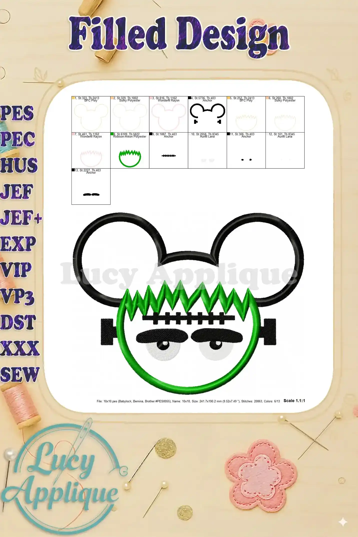 Frankenstein Mickey Ears Applique Design – Instant Download
