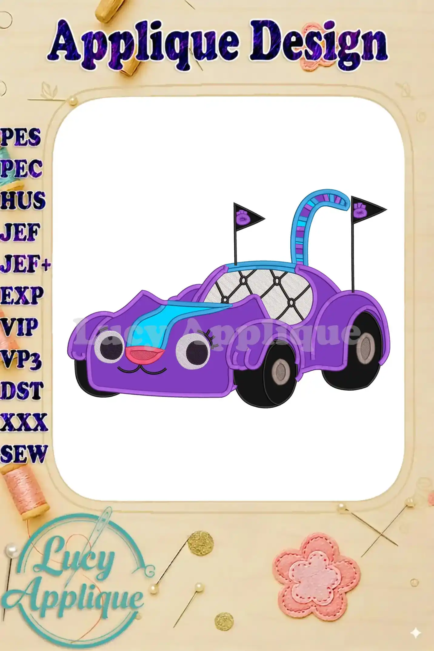 Gabby’s Dollhouse The Movie Purple Cat Car Applique Embroidery Designs