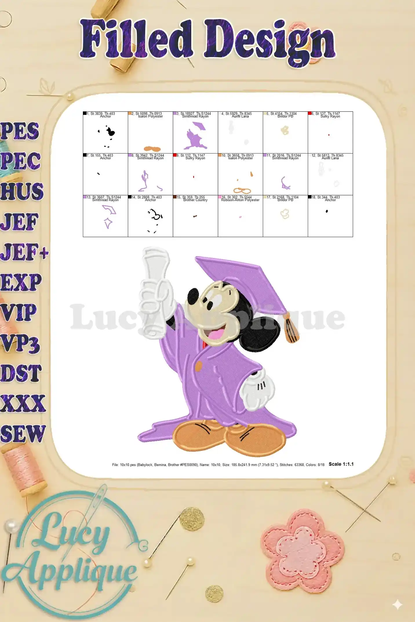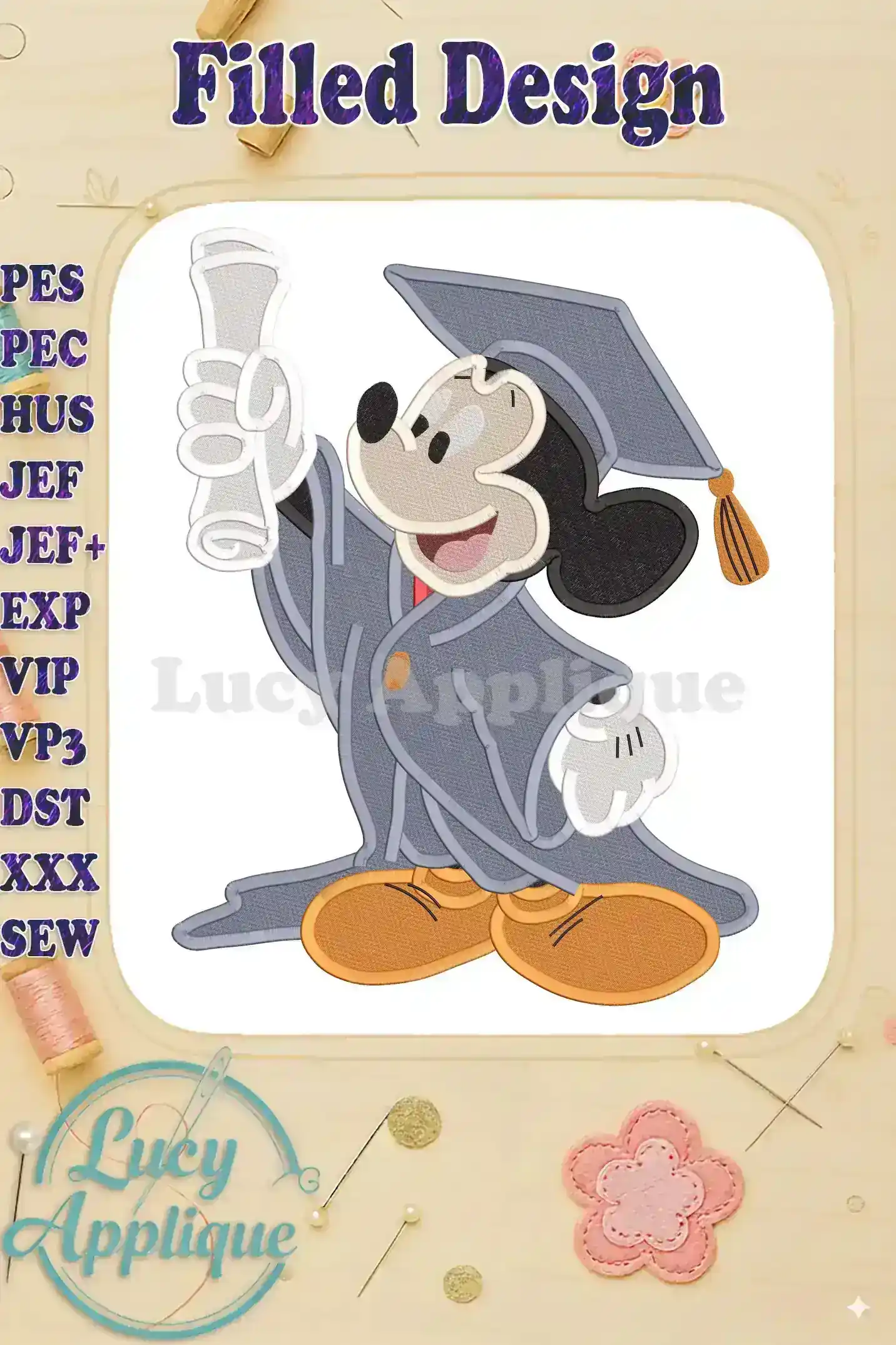 Celebrate graduation with this adorable Mickey Mouse embroidery design! Perfect for apparel, gifts, or home decor, this filled design adds a touch of Disney magic to any project. Download includes multiple formats and color charts for easy stitching.