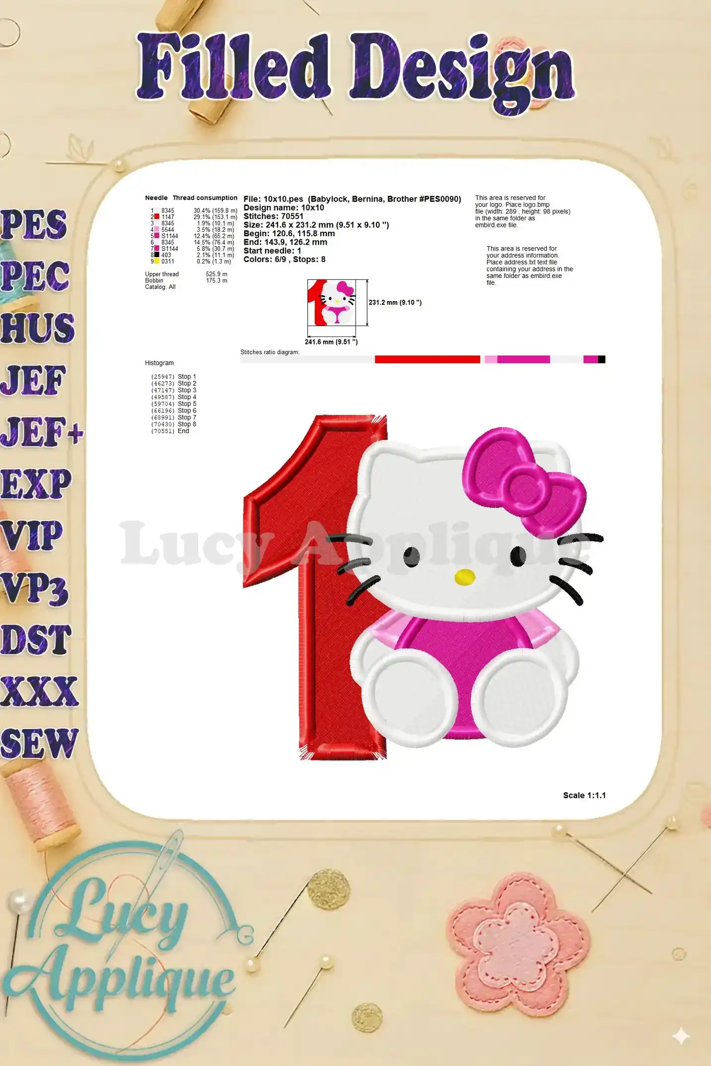 Hello Kitty 1st Birthday Fill Machine Embroidery Design – Instant Download
