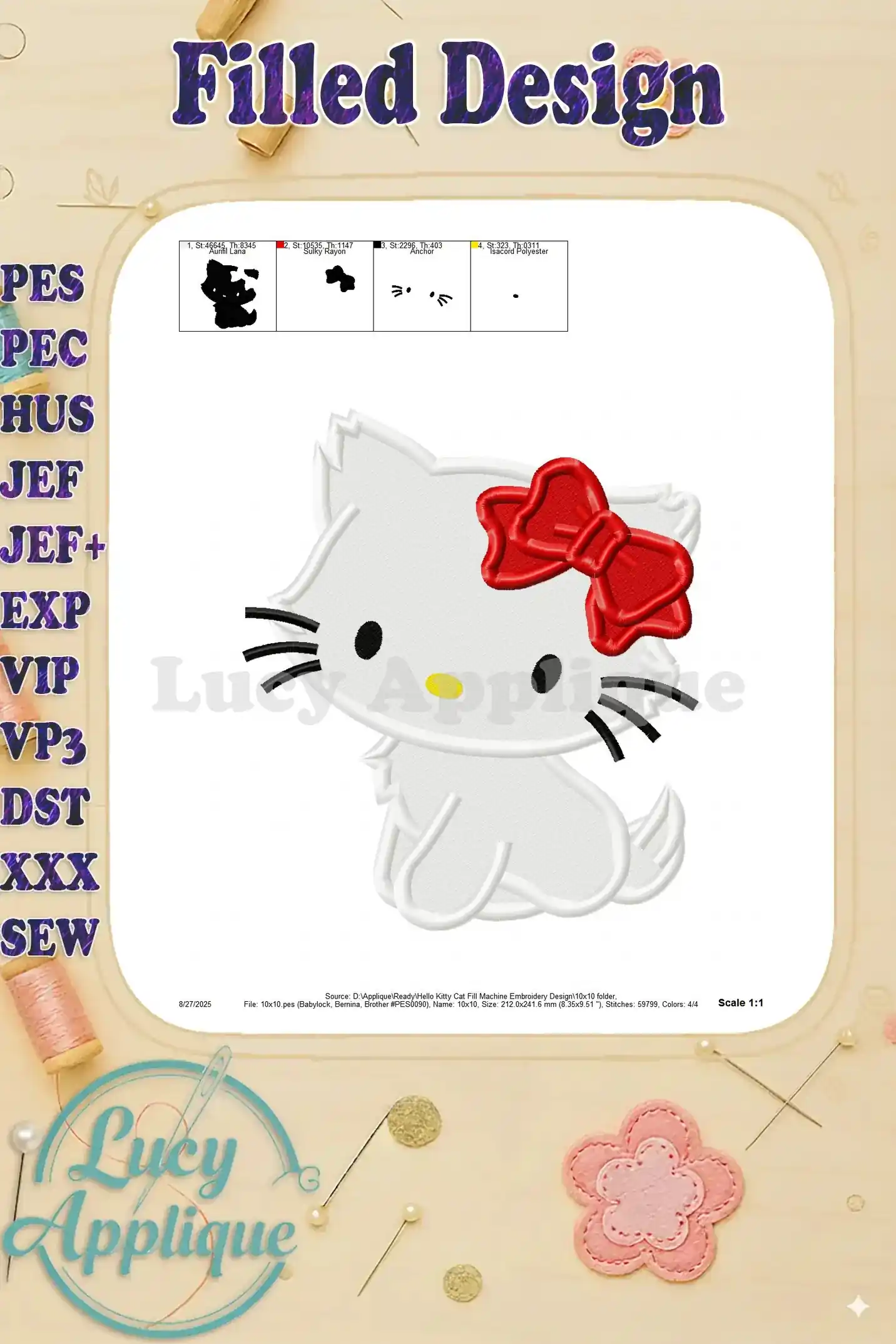 Hello Kitty Cat Fill Machine Embroidery Design – Instant Download