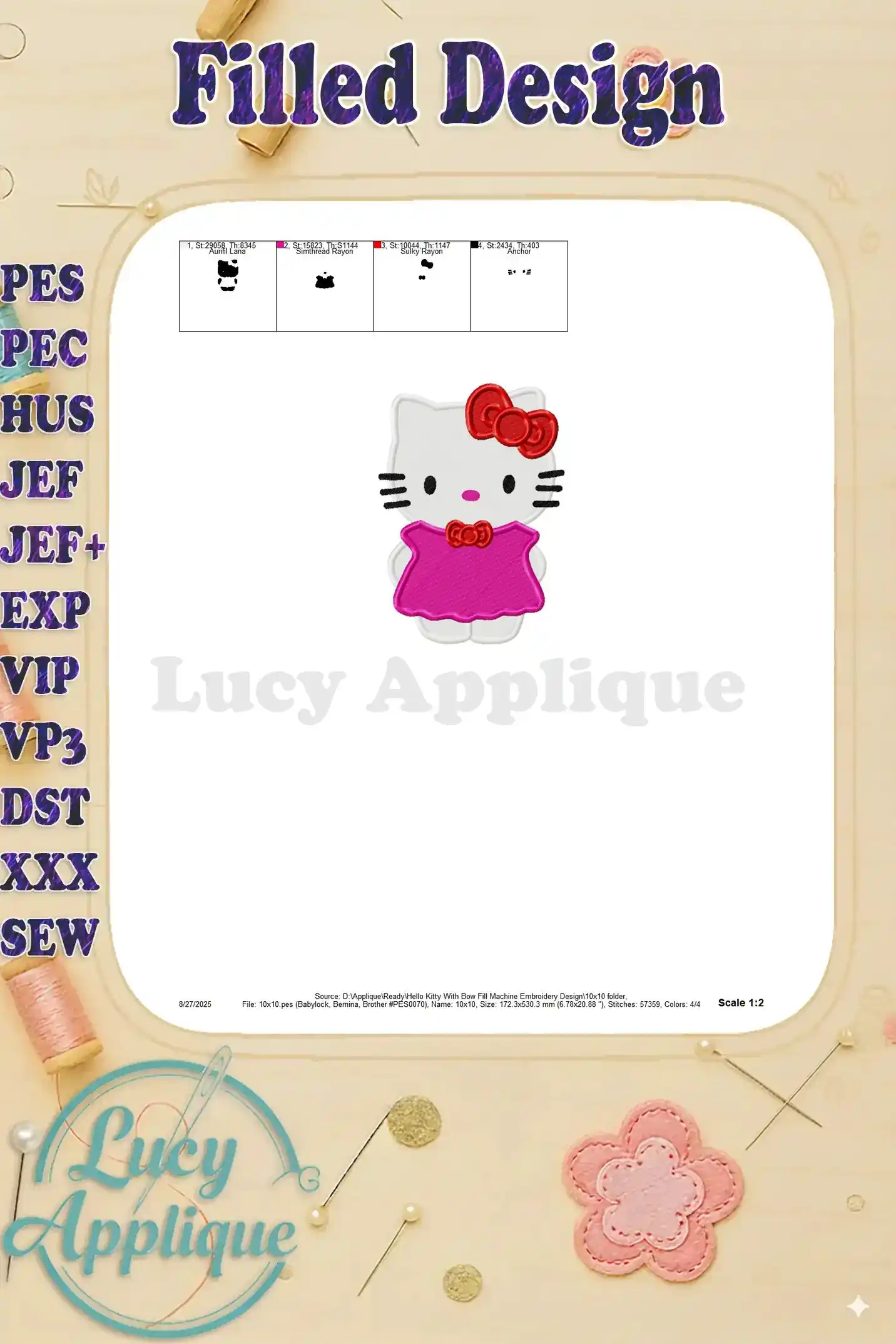 Adorable Hello Kitty machine embroidery design! Perfect for adding a cute touch to clothes, bags, or home decor. Filled stitch design, easy to use.