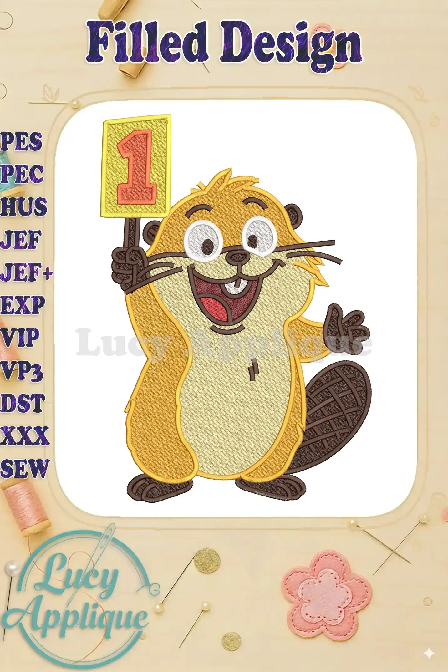 Hoppers Beaver Holding Number One Sign Fill Embroidery Designs