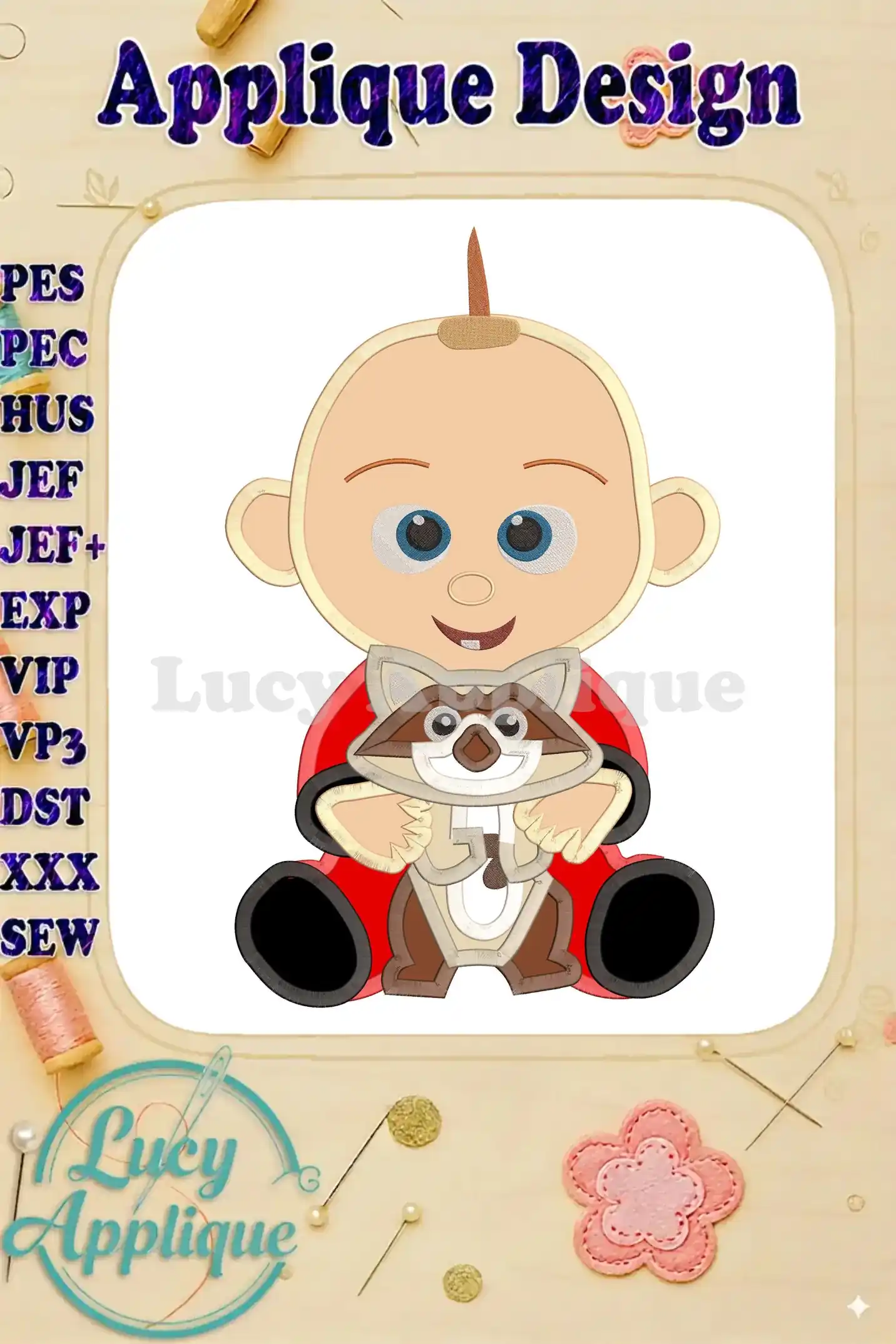 Adorable Jack Jack and Raccoon applique embroidery design! Perfect for Incredibles fans, this design is easy to stitch and looks great on baby clothes or blankets. Get yours now!