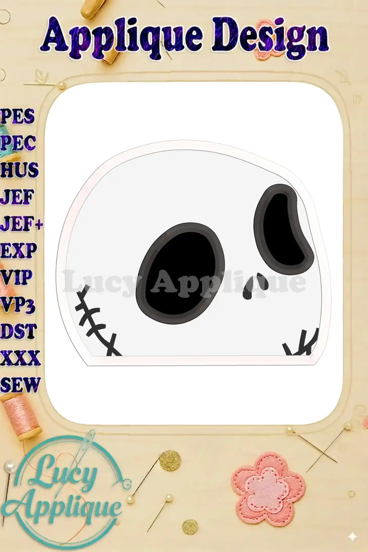 Adorable Jack Skellington applique embroidery design! Perfect for Halloween projects, this easy-to-sew design adds a spooky-cute touch to any fabric.