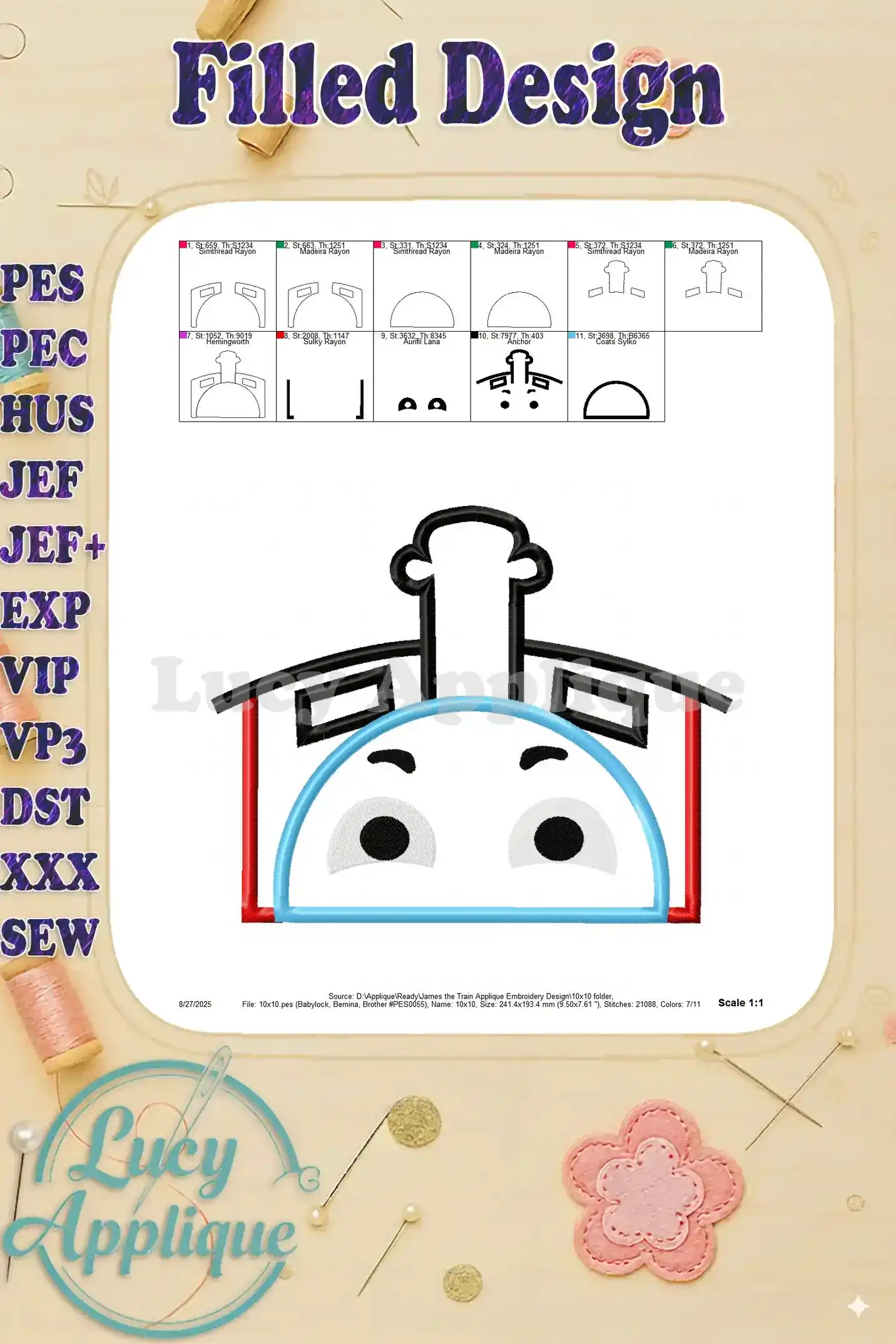Adorable James the Train applique embroidery design! Perfect for kids’ clothes, bags, or home decor. Easy-to-follow instructions and multiple formats included. Add a touch of whimsy to your projects!