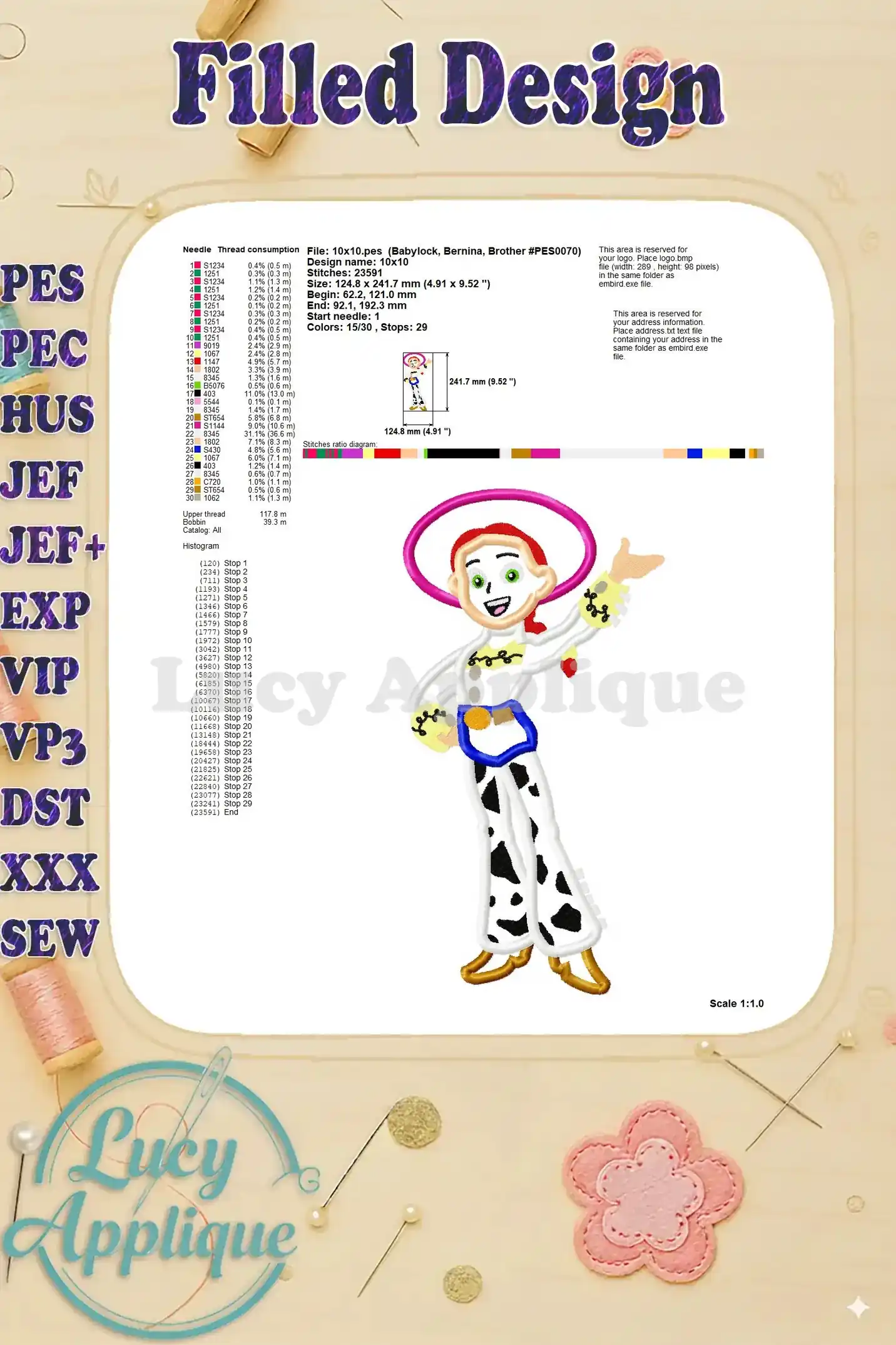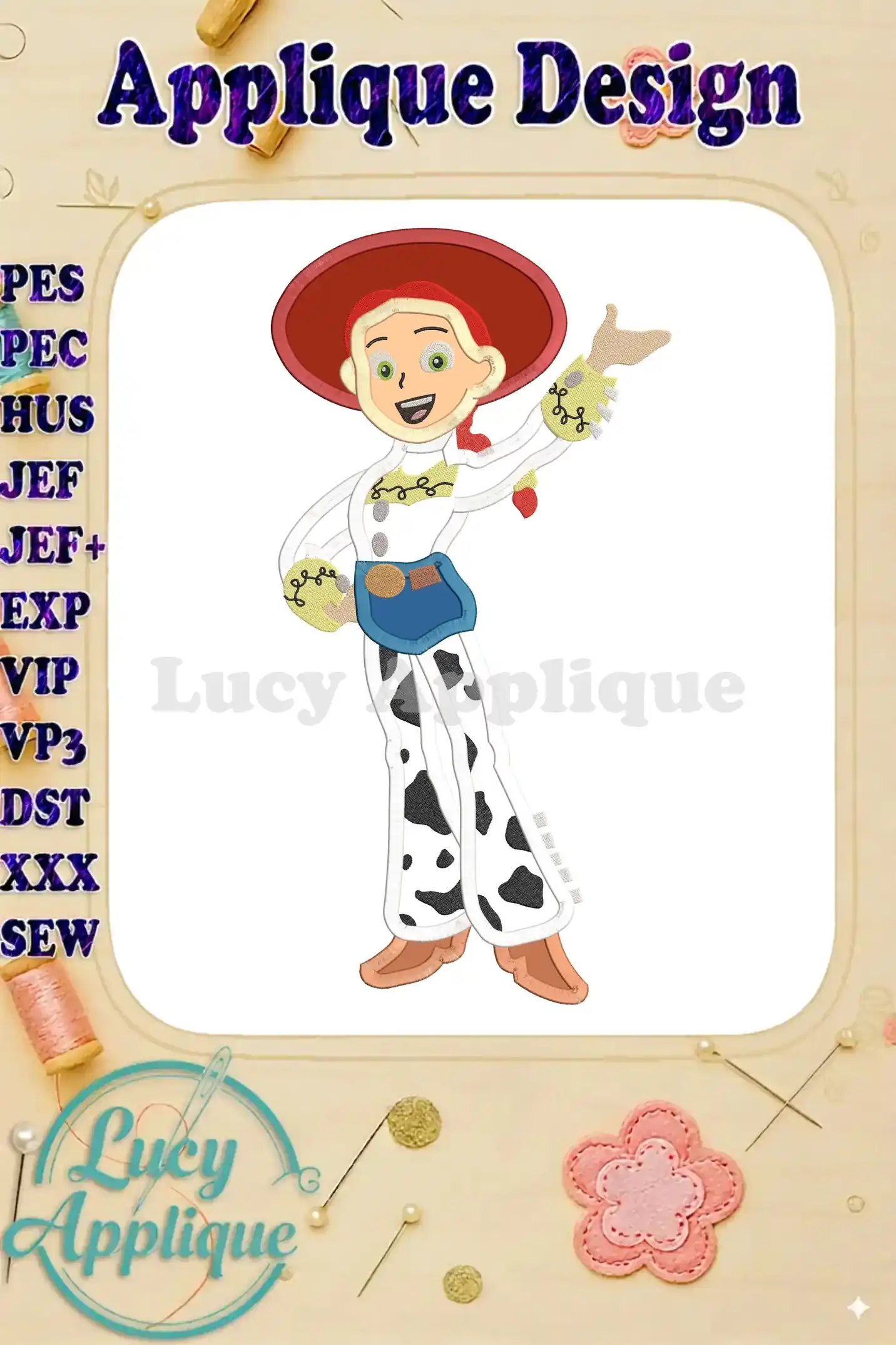 Adorable applique embroidery design of Jessie from Toy Story! Perfect for kids’ clothes, blankets, or bags. High-quality design, easy to stitch.
