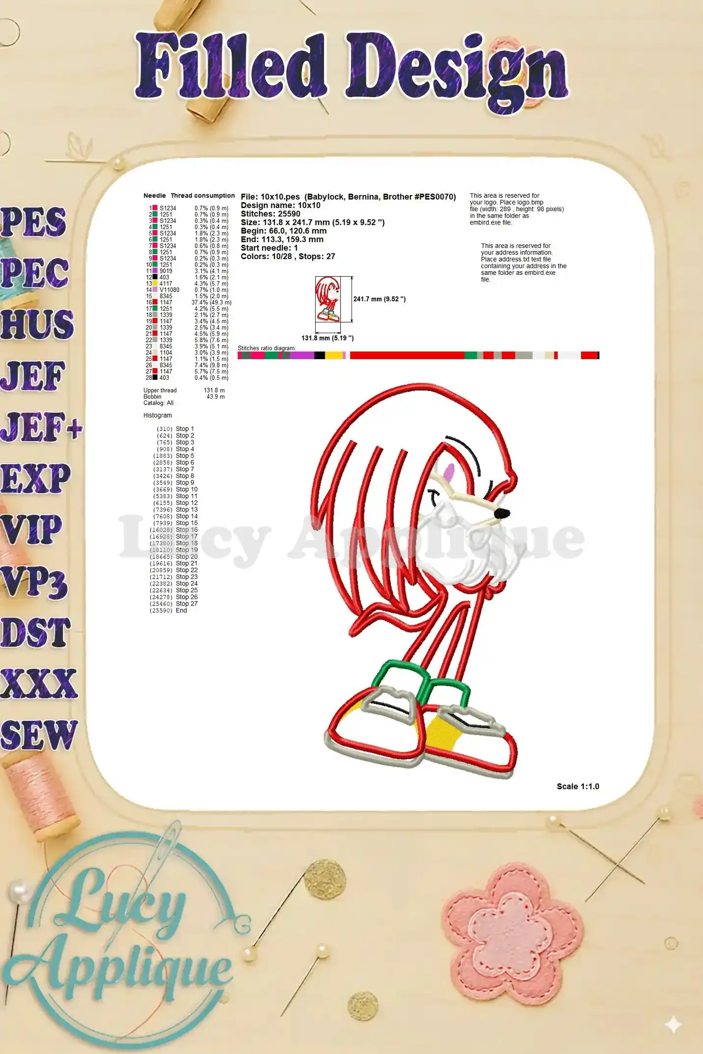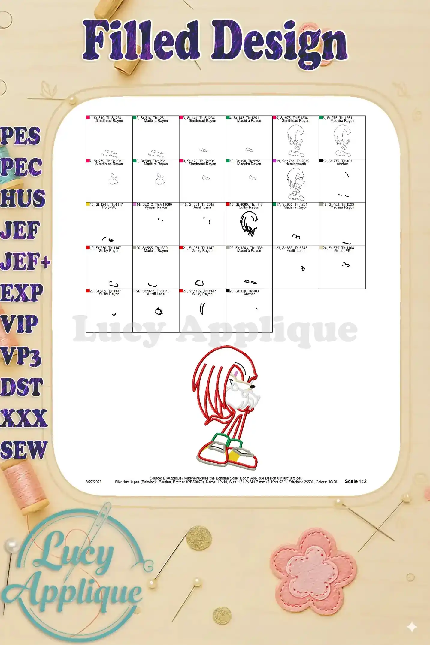 Adorable Knuckles the Echidna applique design! Perfect for Sonic fans, this embroidery pattern is available in multiple formats for various machines. Easy-to-follow instructions included.