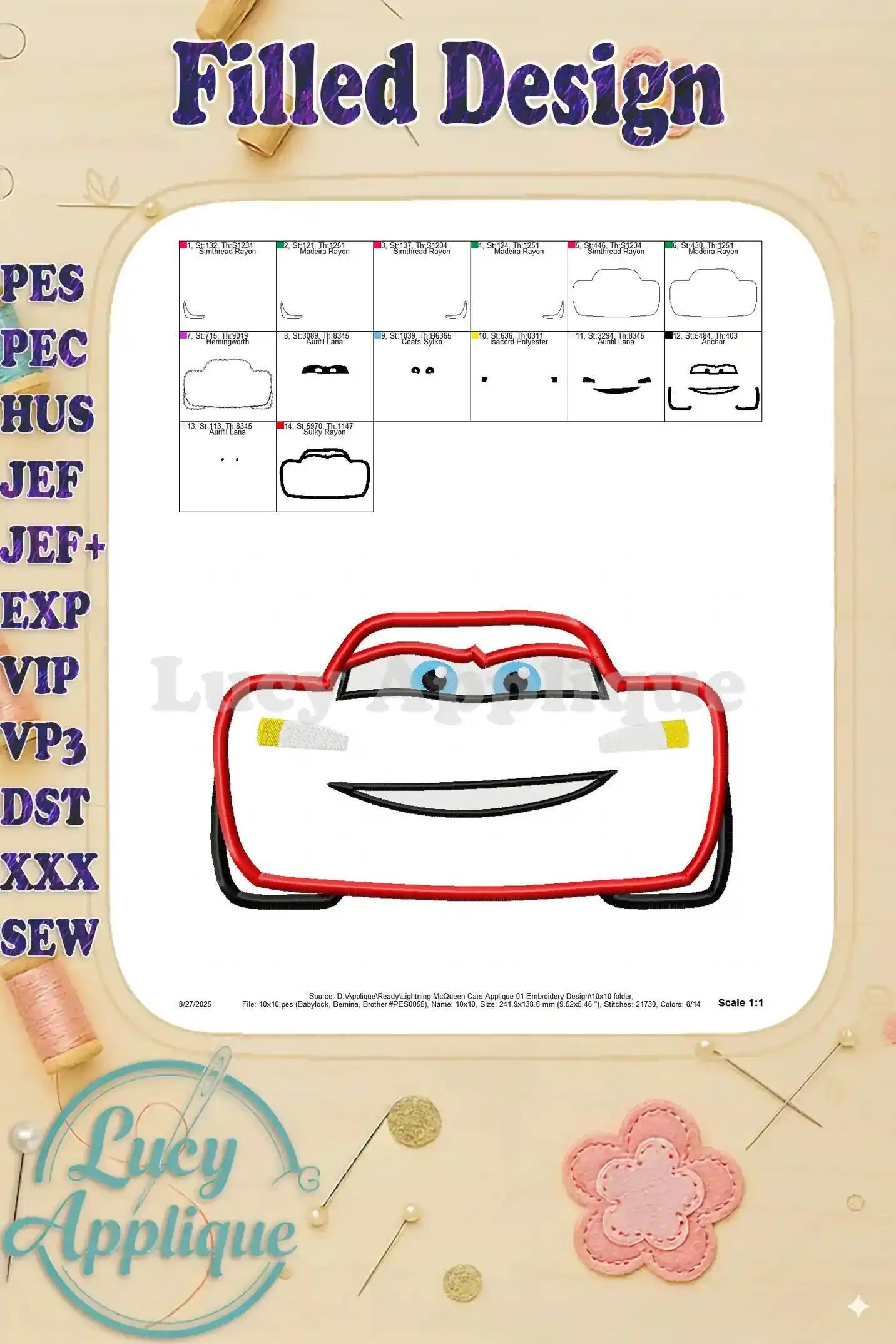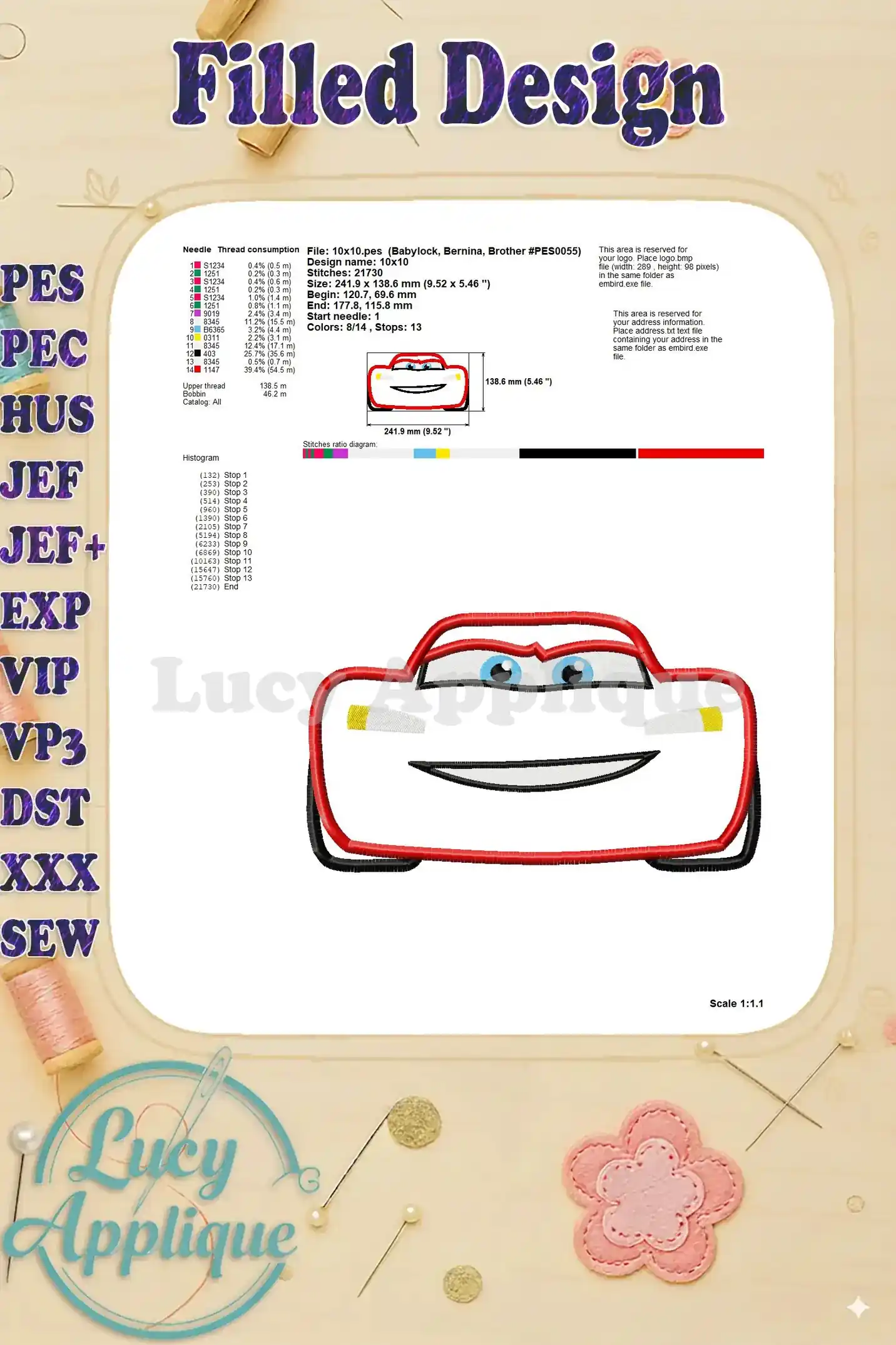 Adorable Lightning McQueen applique embroidery design! Perfect for kids’ clothes, bags, or home decor. Easy-to-follow instructions and multiple file formats included. Stitch this iconic car today!