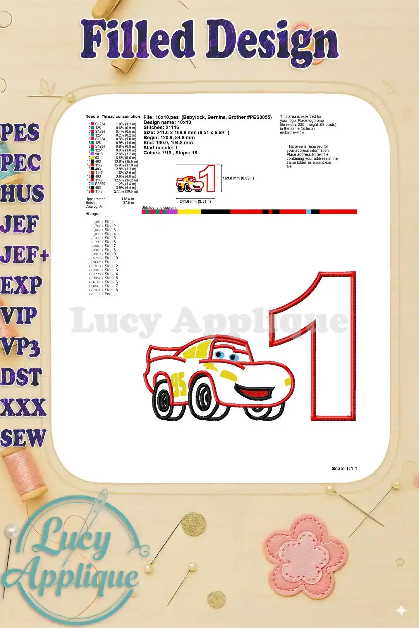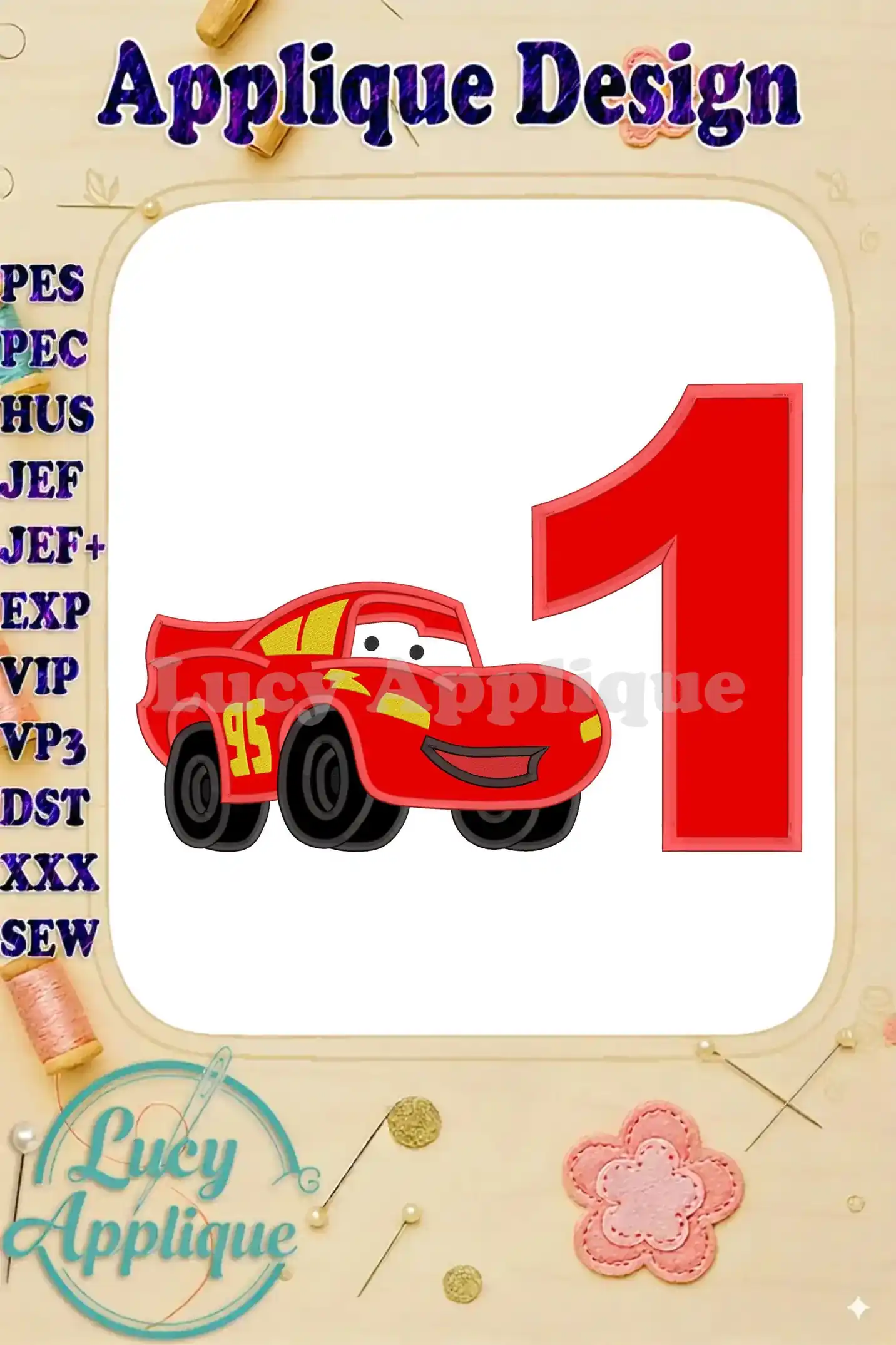 Lightning McQueen Cars Birthday Number 1 Applique 03 Design – Instant Download