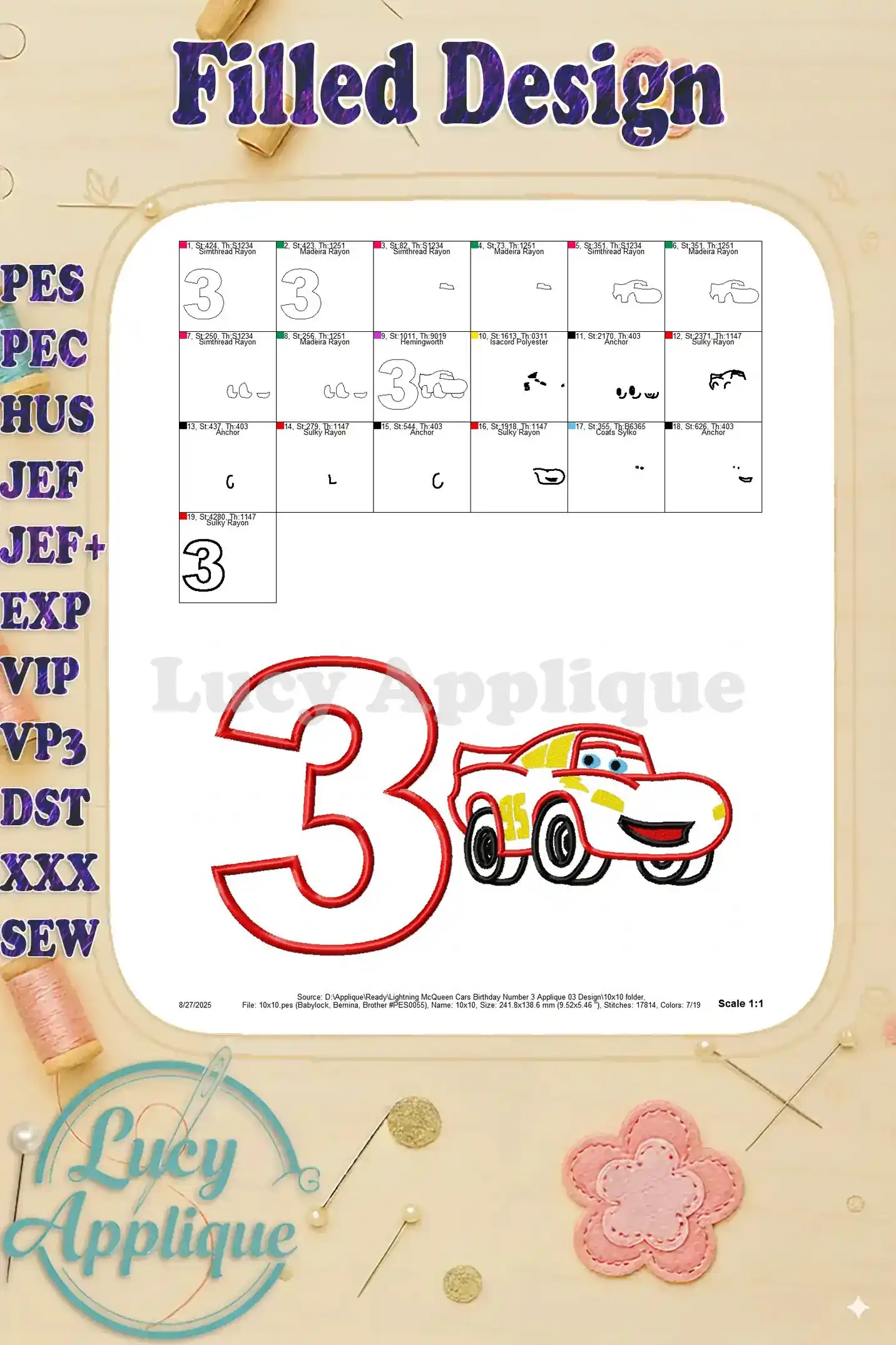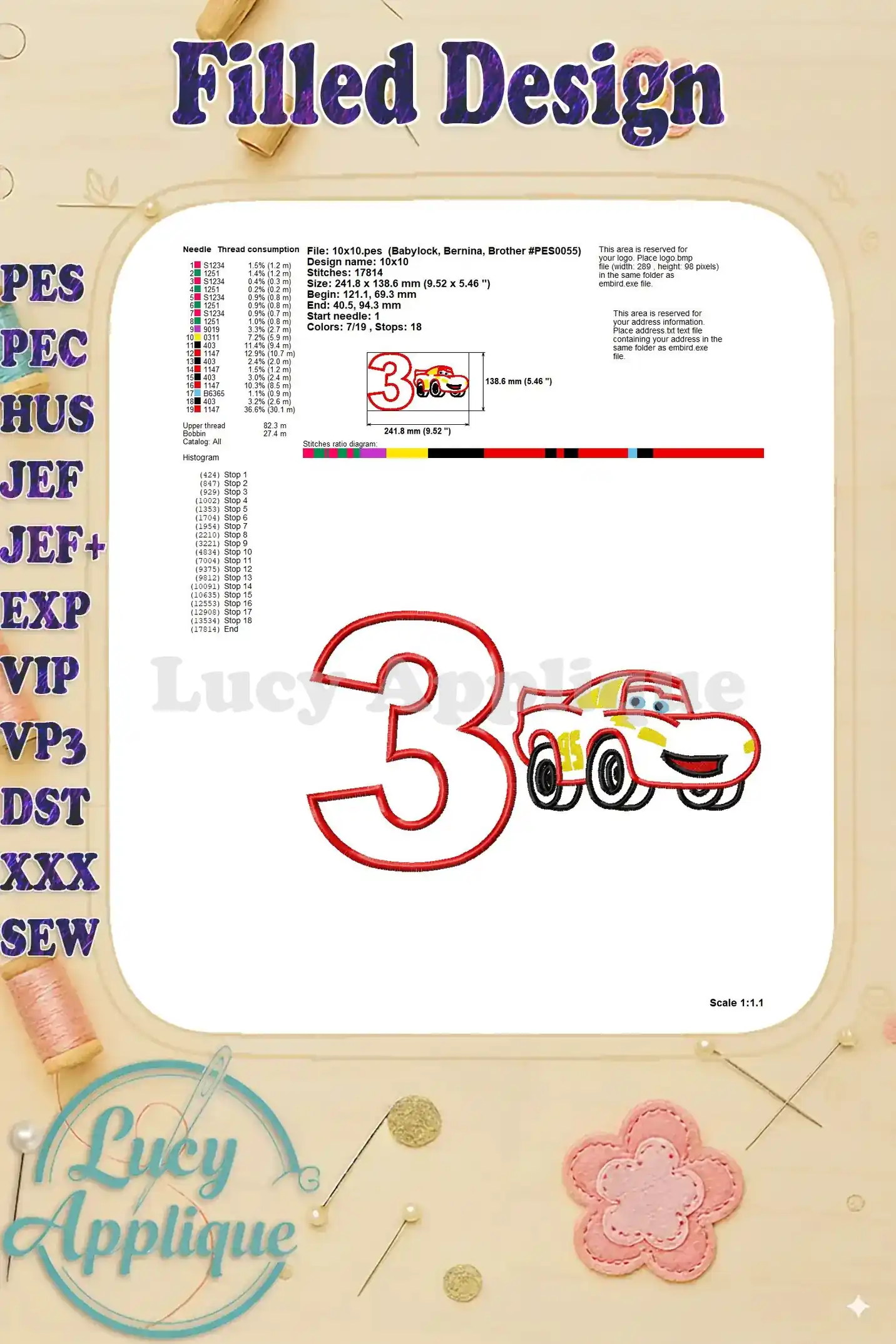 Lightning McQueen Cars Birthday Number 3 Applique 03 Design – Instant Download