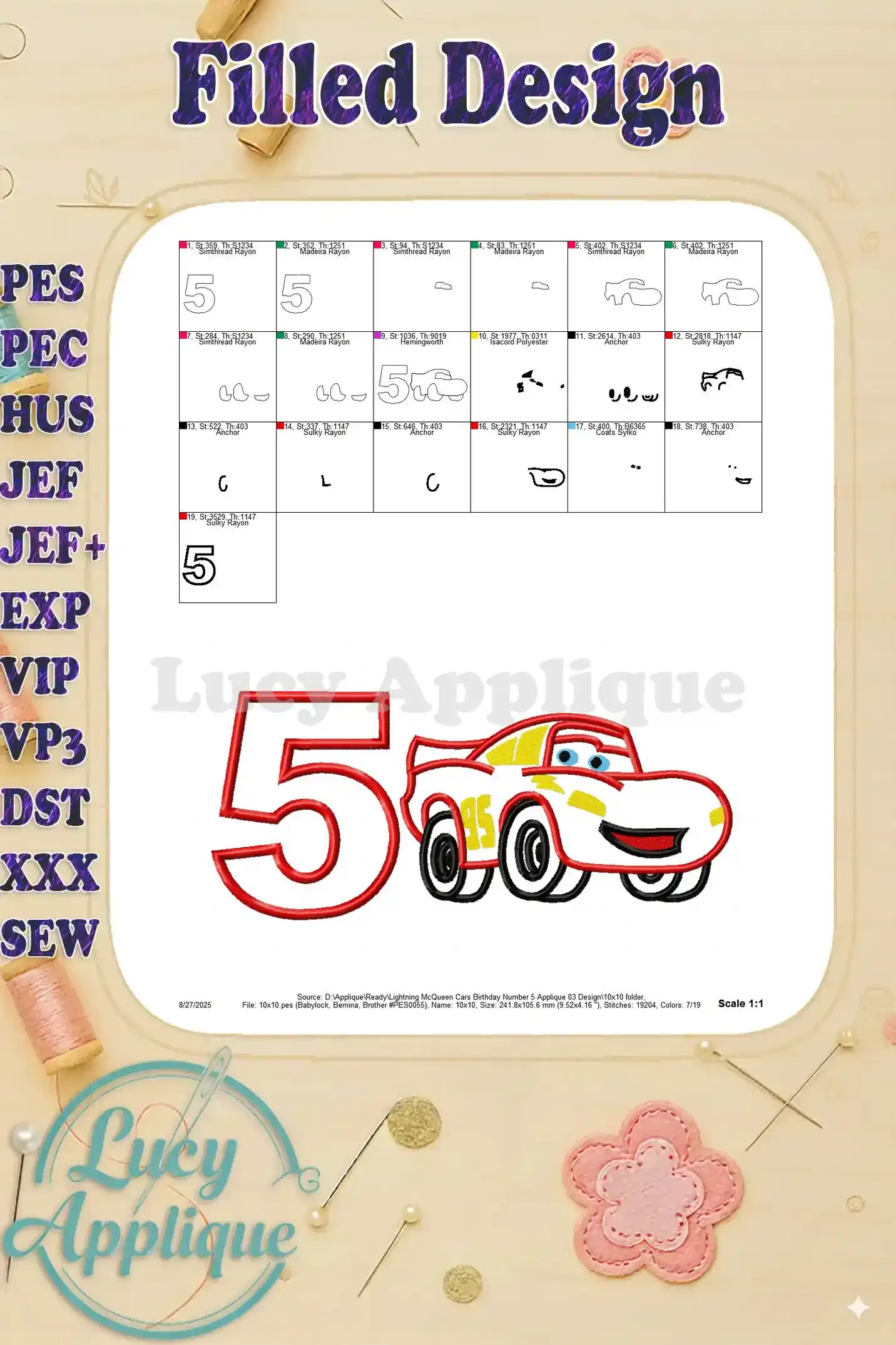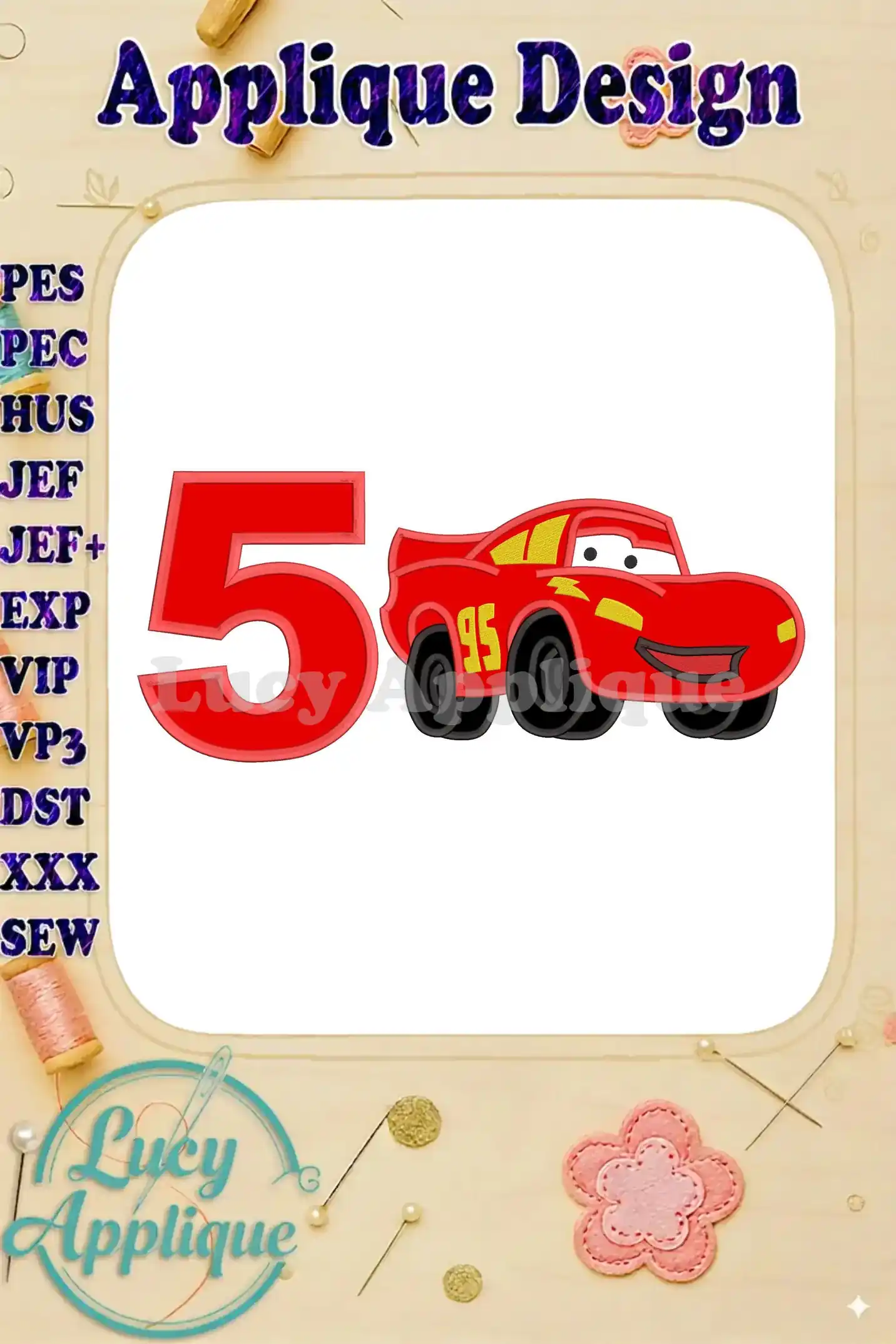 Lightning McQueen Cars Birthday Number 5 Applique 03 Design – Instant Download