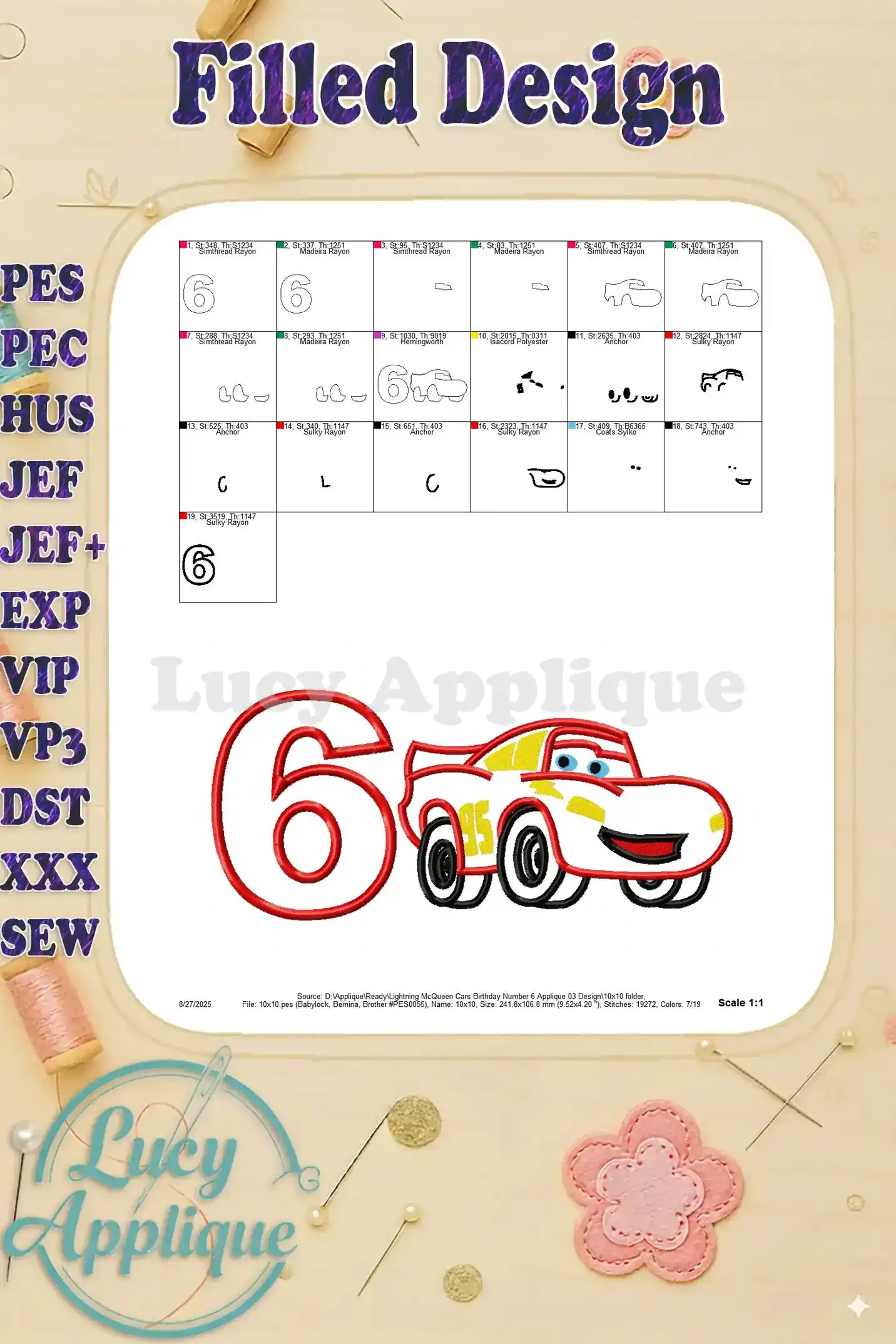 Lightning McQueen Cars Birthday Number 6 Applique 03 Design – Instant Download