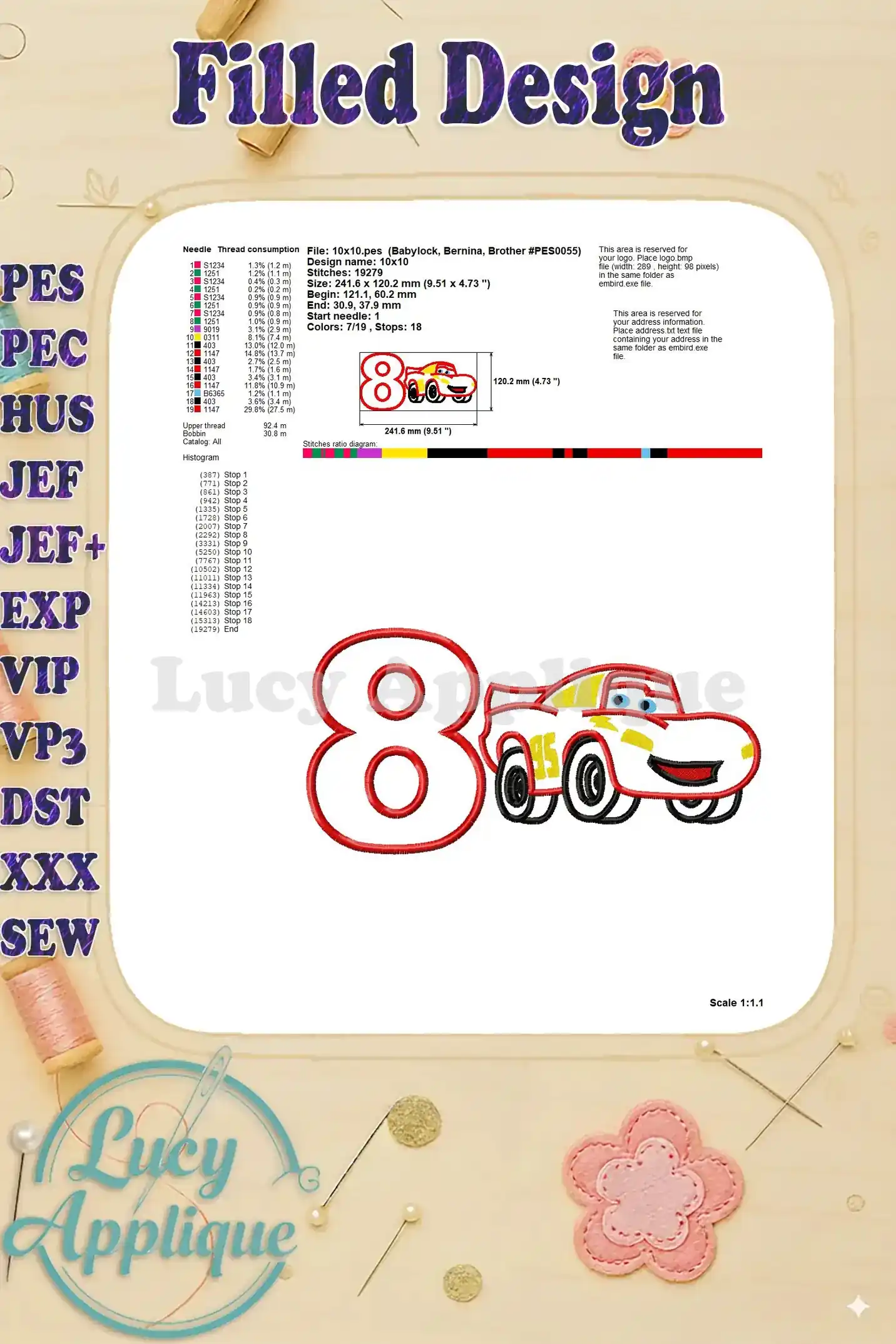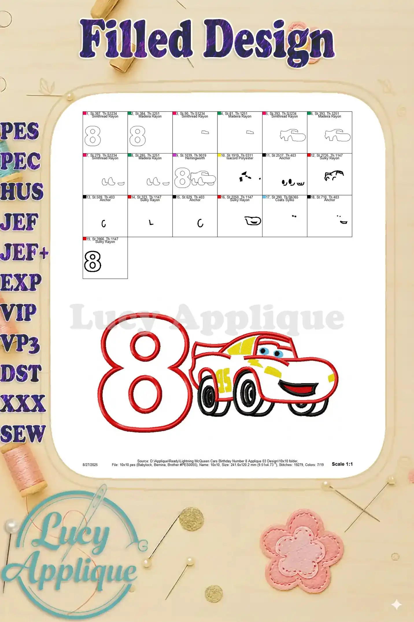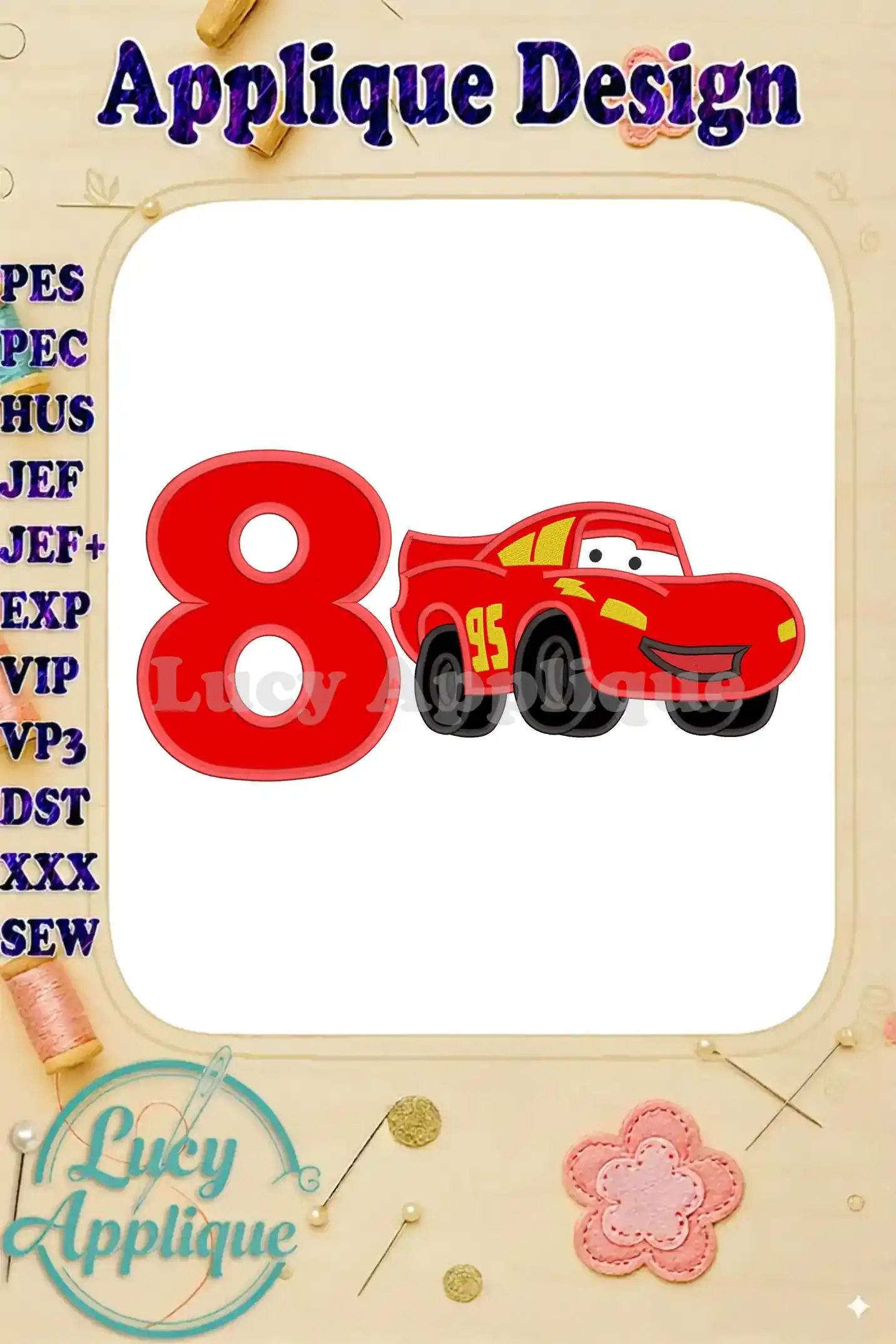 Lightning McQueen Cars Birthday Number 8 Applique 03 Design – Instant Download